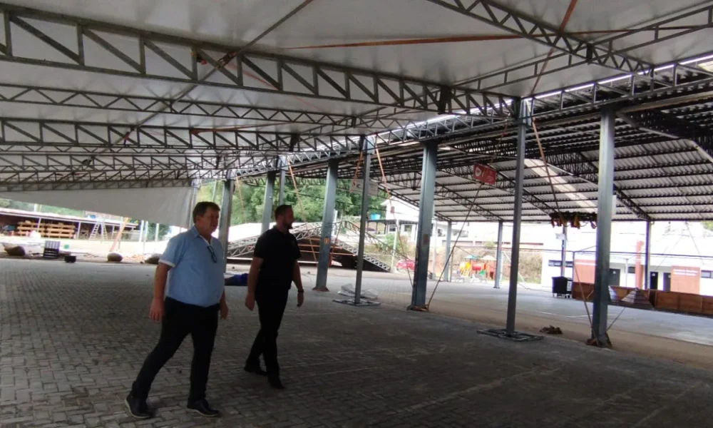Prefeito Chilo e vice Félix conferindo a ampliação da estrutura da festa para o lado do rio Cadeia, uma das boas novidades deste ano