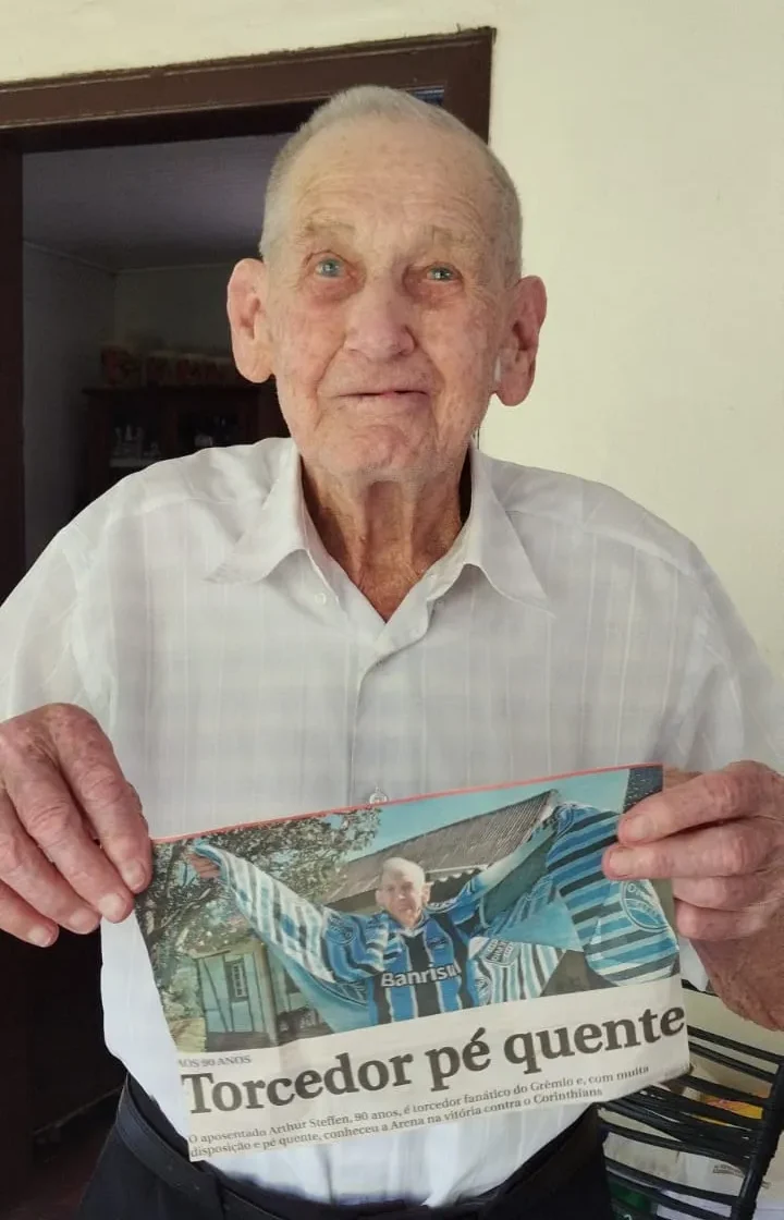 Quero abrir um espacinho para falar do seu Arthur, que ontem completou 100 anos. Com 14 filhos, o aniversário do tio do Pingo foi ontem, então, meus parabéns ao seu Arthur Steffen, do Franckenthal, o bisavô que não abre mão da sua cervejinha e que exige que seja Brahma!