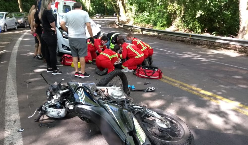 Picada Café – Um jovem de 20 anos teve fraturas e outros graves ferimentos em um acidente por volta das 14h30 deste sábado, 2, no km 206 da BR-116. O rapaz pilotava uma Yamaha XTZ 125E preta, emplacada em São Leopolso, e colidiu com um HB20 branco, de Morro Reuter. Quatro pessoas estavam no carro, mas nenhuma se feriu. O motociclista foi socorrido pelo Corpo de Bombeiros Voluntários e encaminhado ao Hospital Nova Petrópolis.