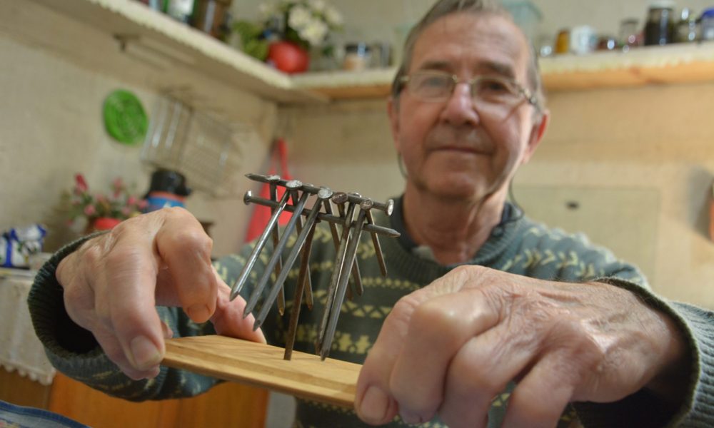 Com cuidado, Lauro organiza 12 pregos de forma que fiquem todos sob um único prego, sem cair (FOTO: Cleiton Zimer)