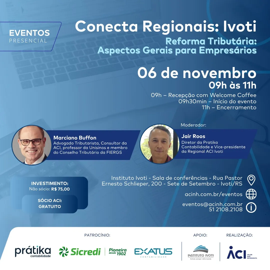 Inscrições devem ser feitas em https://www.acinh.com.br/evento/conecta-regionais-ivoti-reforma-tributaria-aspectos-gerais-para-empresarios