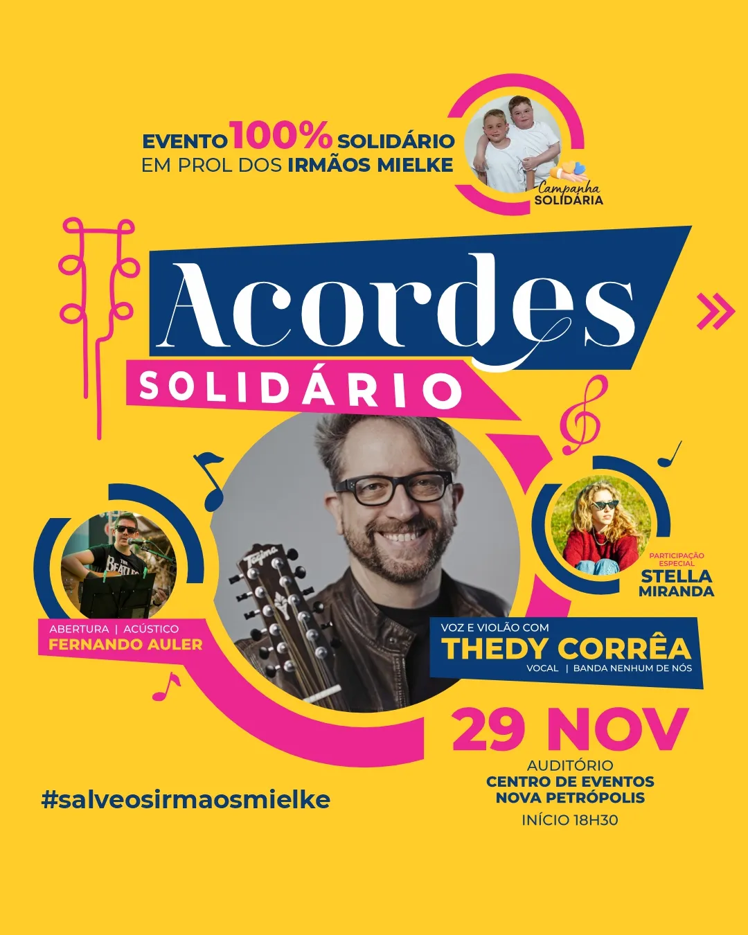 A solidariedade vai tomar conta do Centro de Eventos de Nova Petrópolis, amanhã, sexta-feira, 29, a partir das 18h30, com o evento Acordes Solidário – Salve os Irmãos Mielke. A ação reunirá grandes artistas em uma noite musical totalmente solidária, dedicada a apoiar o tratamento dos irmãos Felipe e Igor Mielke, diagnosticados com Distrofia Muscular de Duchenne (DMD), uma doença genética rara e progressiva que compromete os músculos e limita a mobilidade.