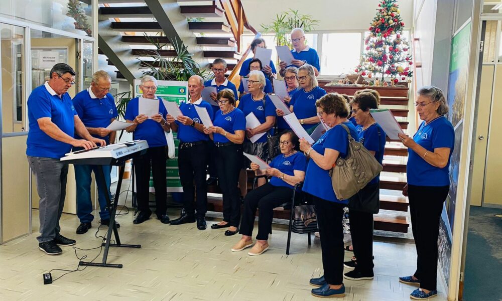 Dois Irmãos – Uma das ações do Clube de Idosos Reviver no Natal é realizar apresentações de cantos natalinos. E os servidores da sede da Prefeitura Municipal de Dois Irmãos novamente foram presenteados com uma emocionante apresentação, na manhã da última terça-feira, 7. Para finalizar com chave de ouro, o grupo distribui abraços calorosos e desejou um Feliz Natal! Além da apresentação em órgãos públicos, casas de saúde e veículos de comunicação, o Clube também presenteia os idosos que estão nos lares geriátricos com pequenos mimos natalinos.