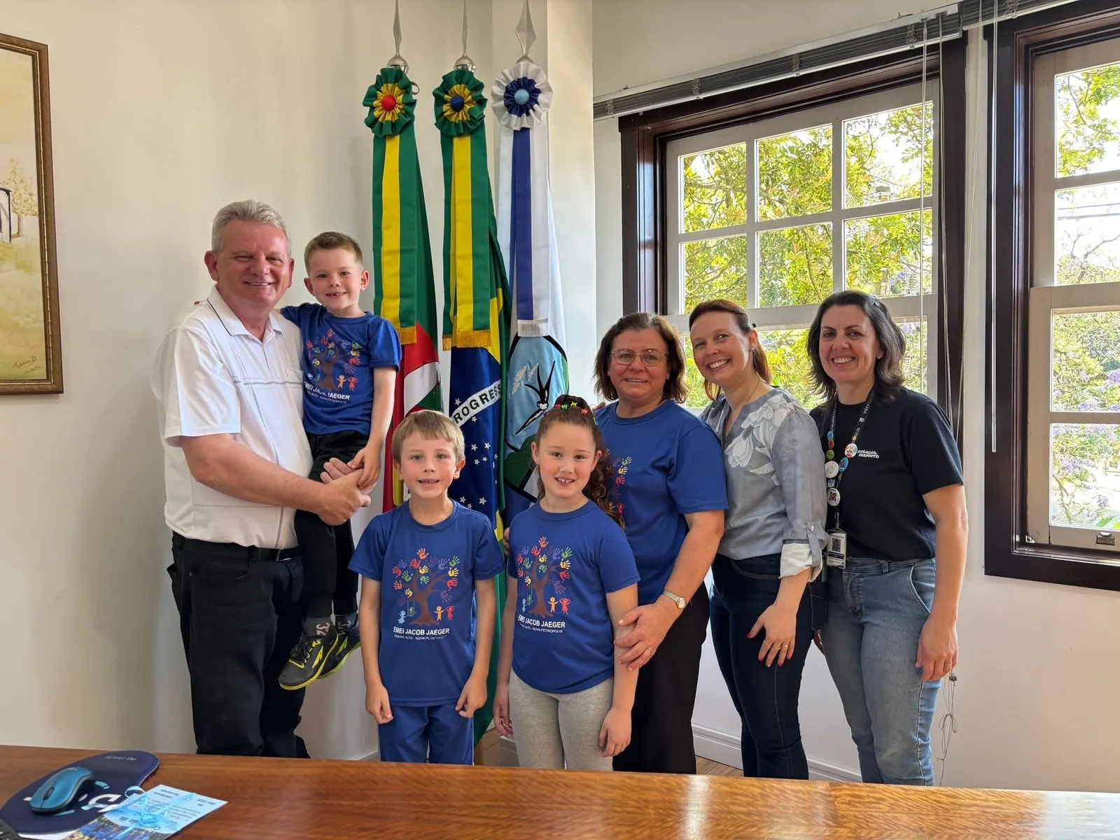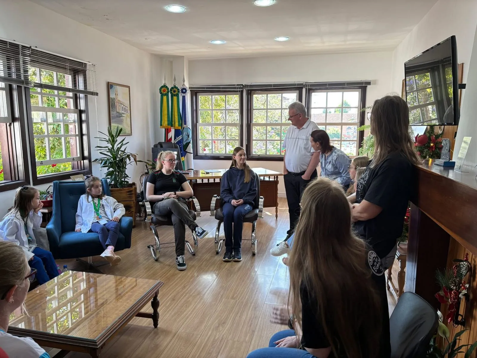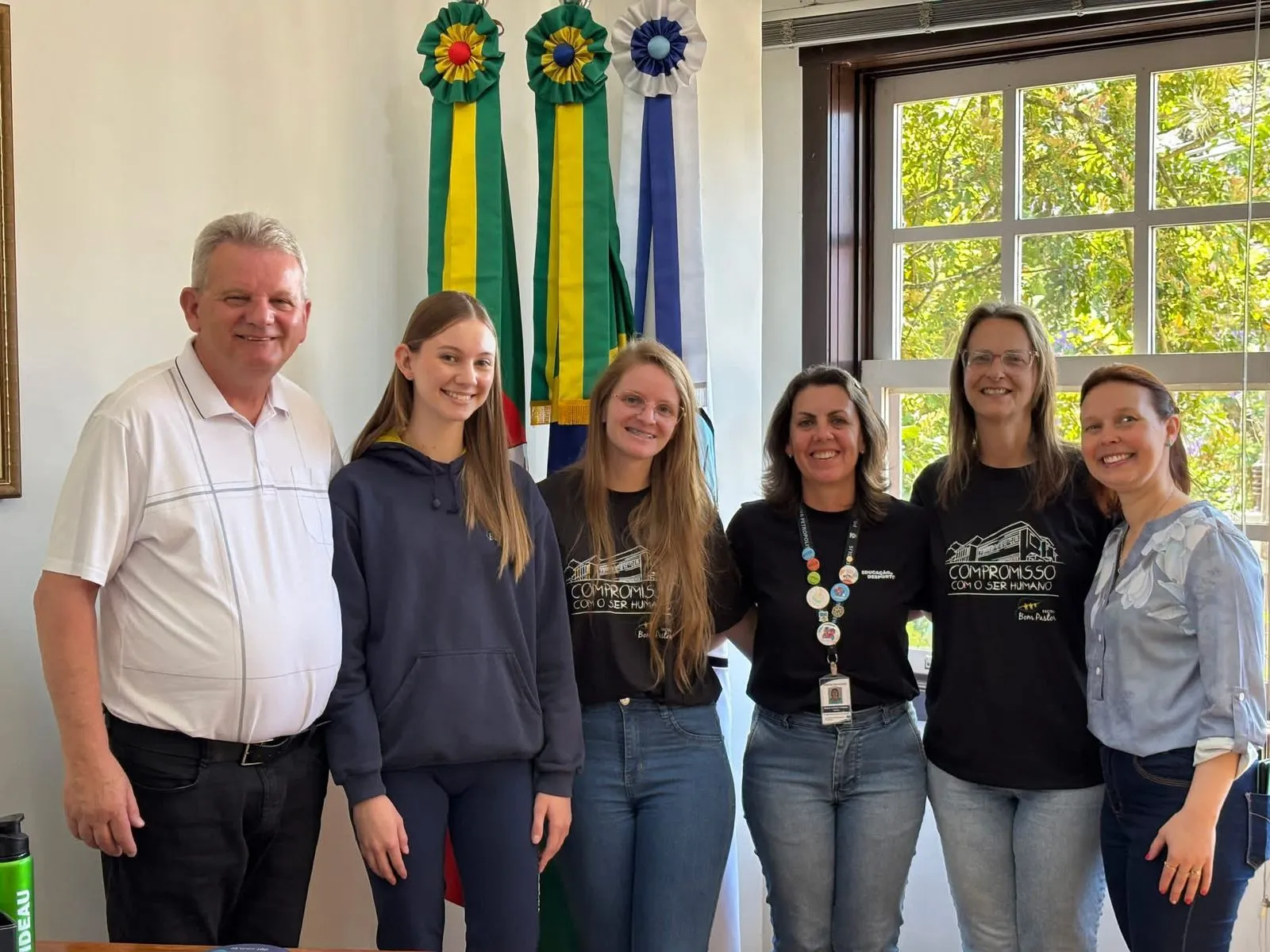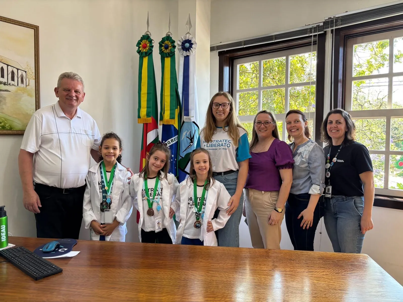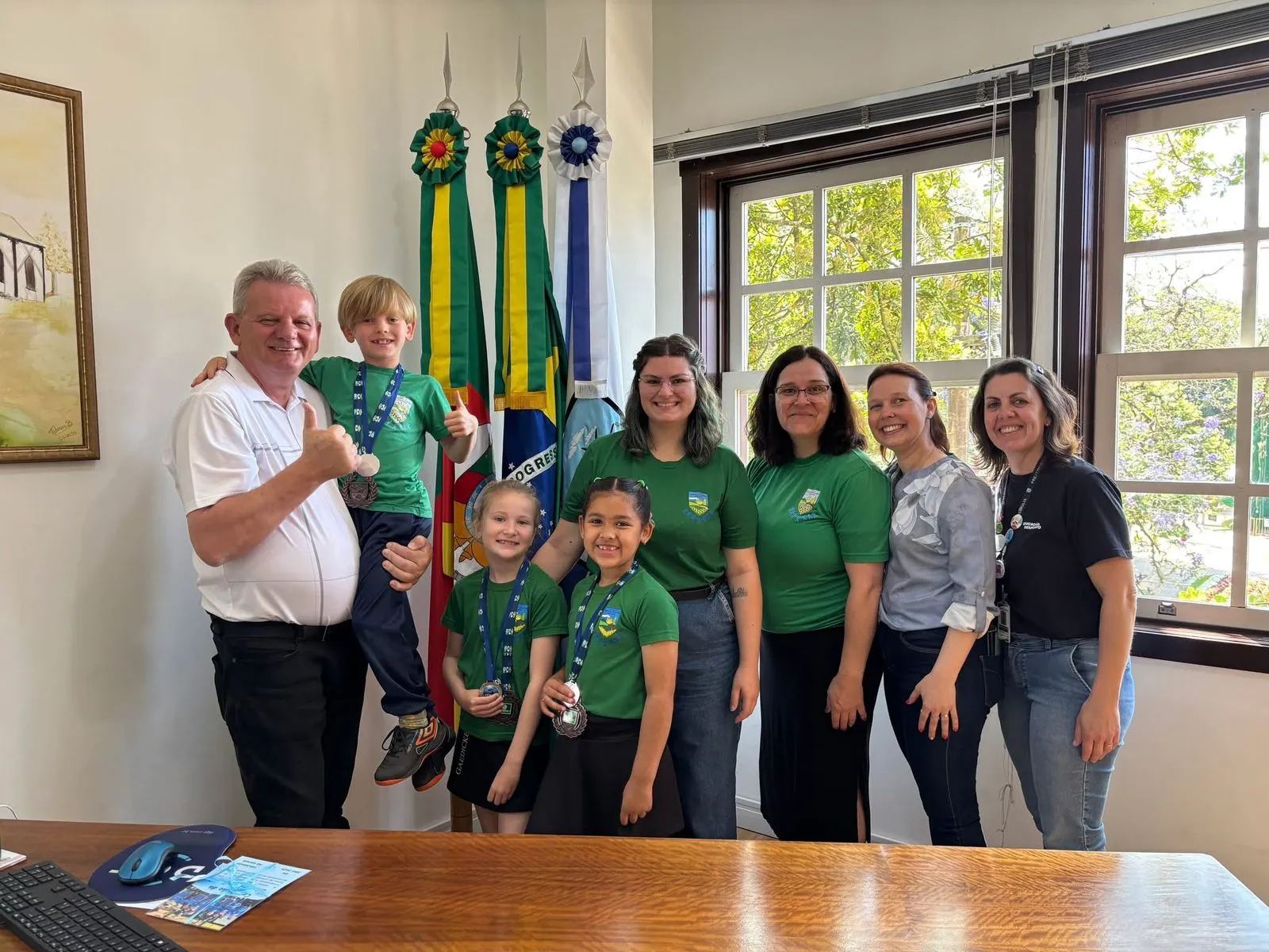 Na manhã de quarta-feira, 26, a Administração Municipal recebeu no Gabinete Oficial os alunos da rede municipal de ensino que conquistaram posições de destaque em Mostras Científicas e Olimpíadas Escolares realizadas em nível estadual ao longo de 2025. A Secretaria Municipal de Educação e Desporto acompanhou a visita, que também contou com a presença da equipe pedagógica envolvida nos projetos.