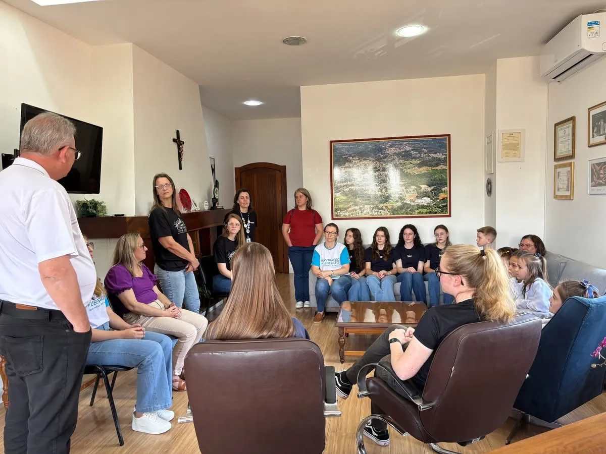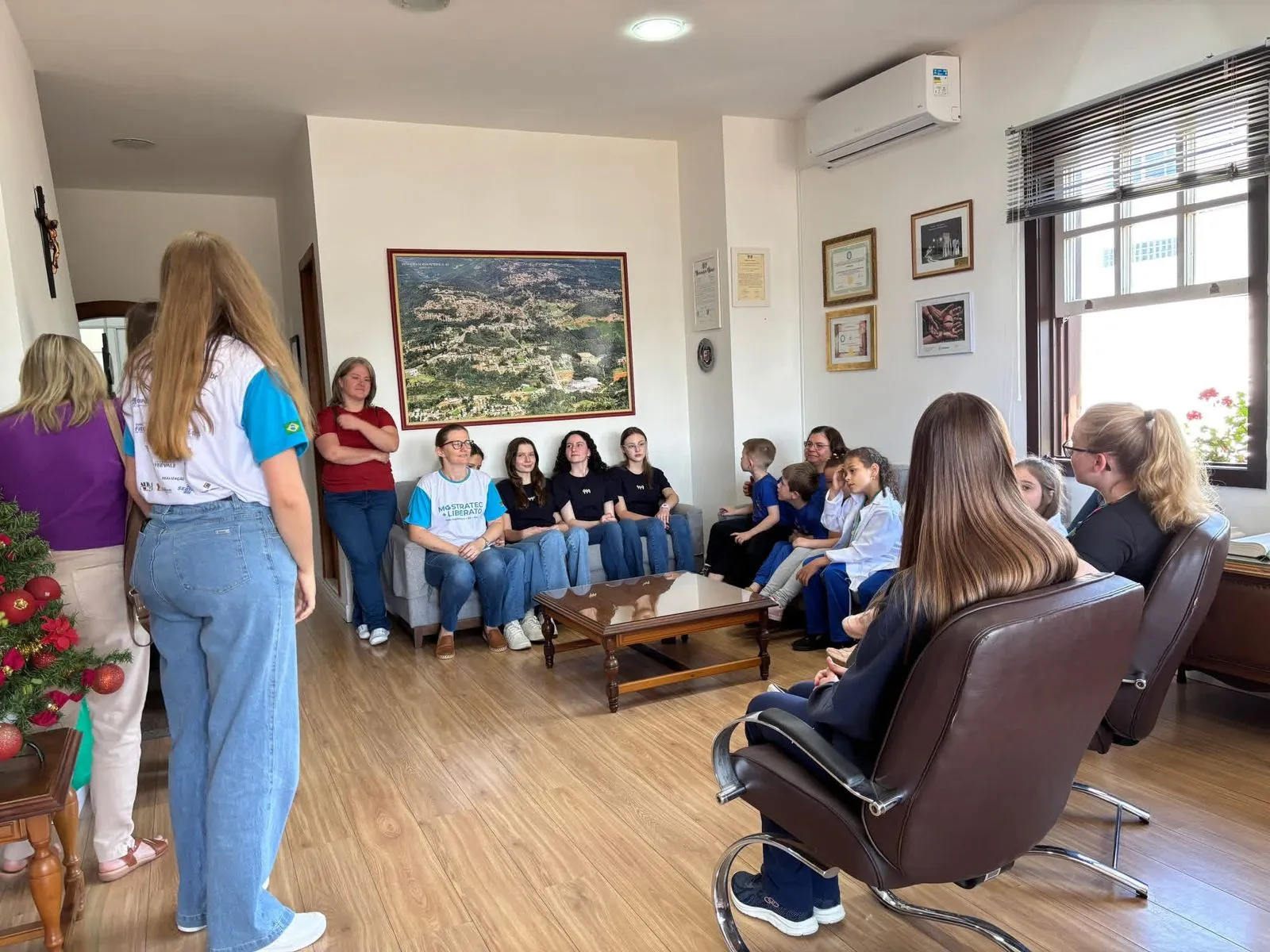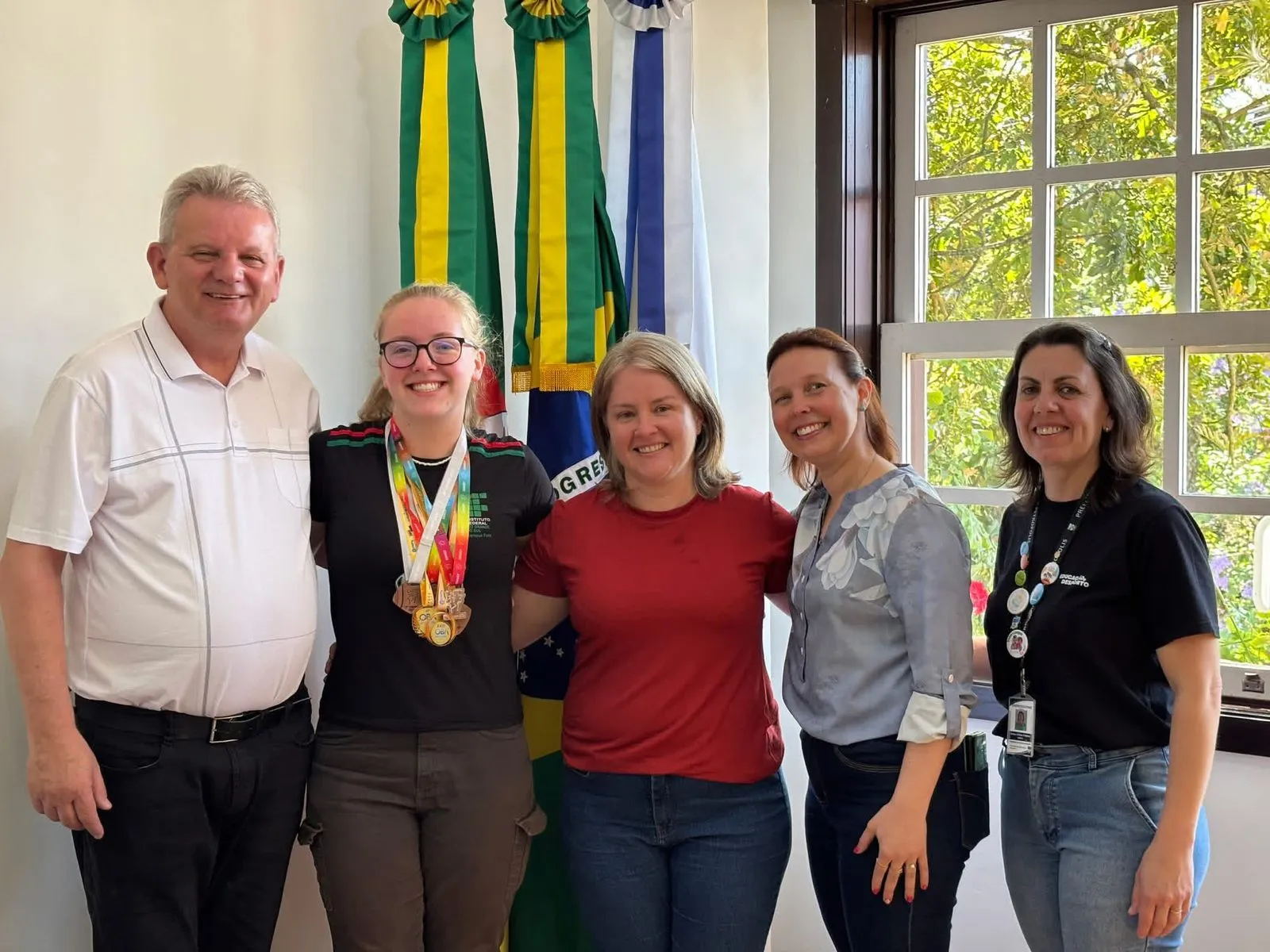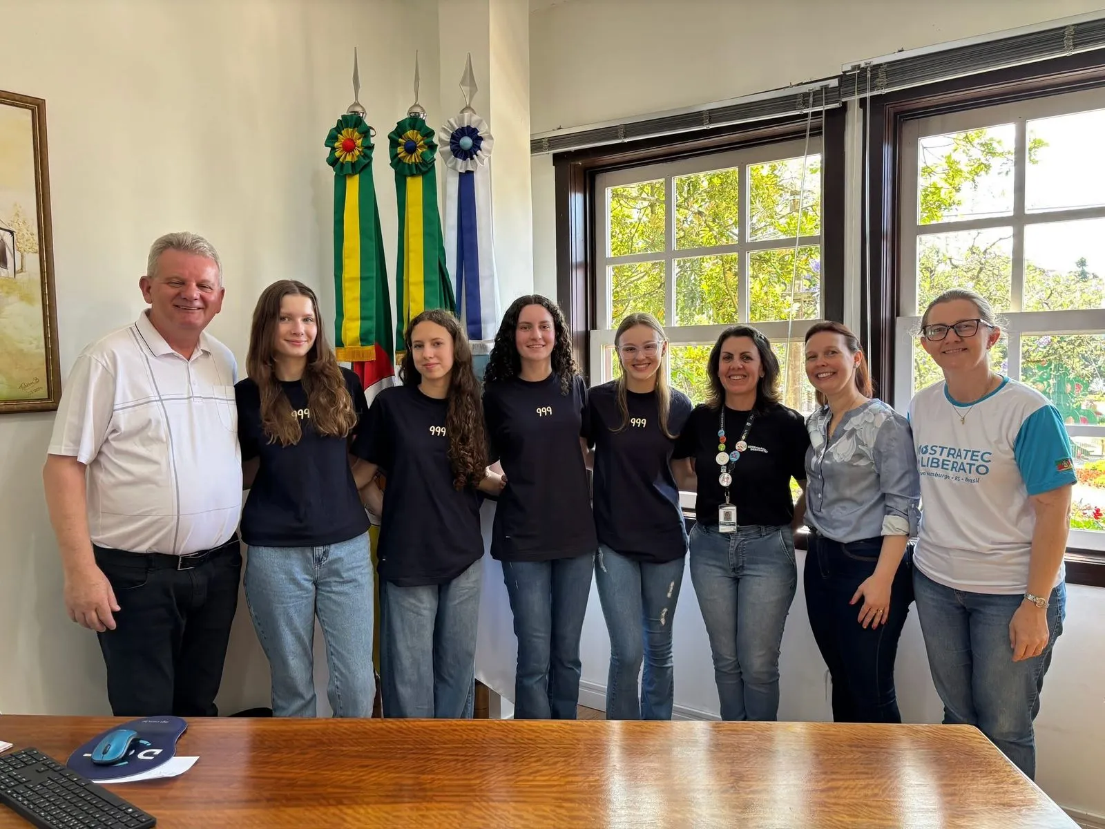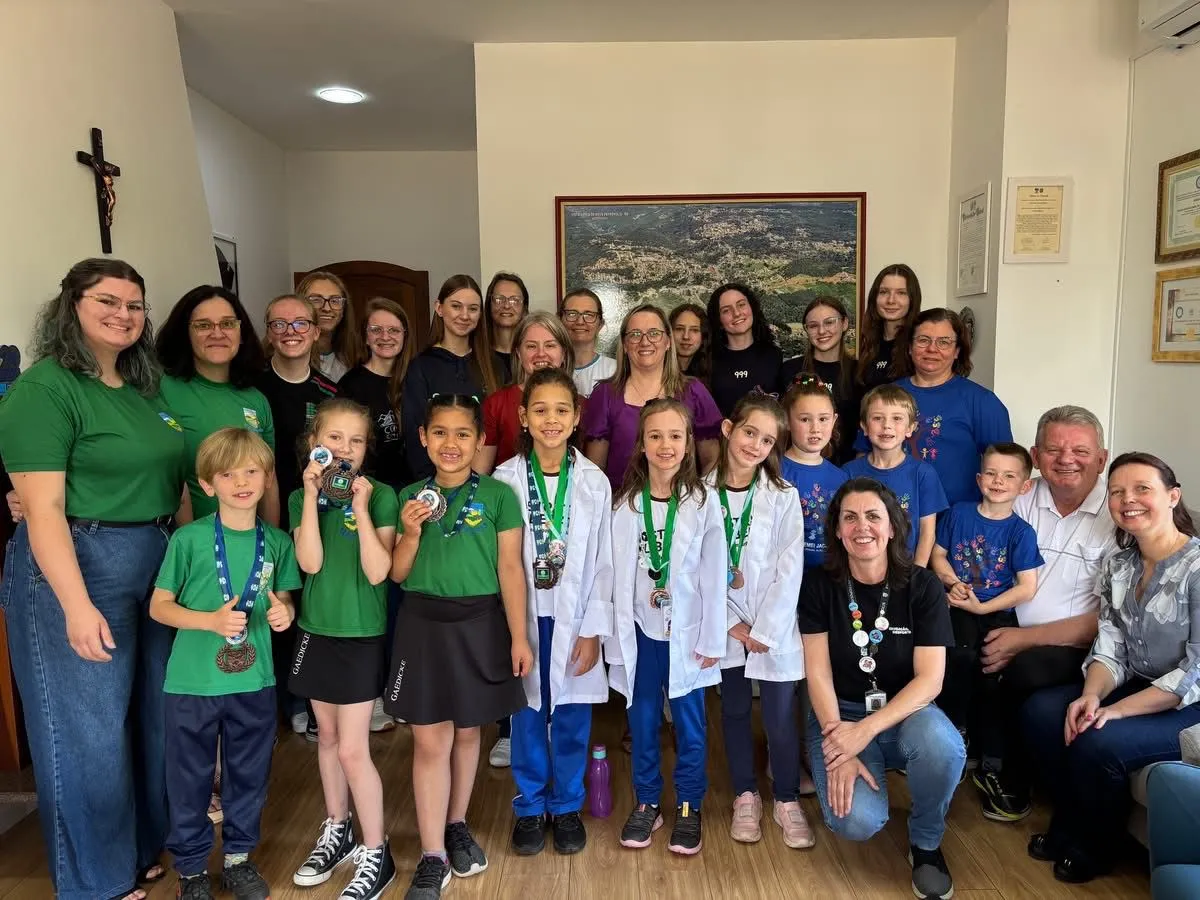 Na manhã de quarta-feira, 26, a Administração Municipal recebeu no Gabinete Oficial os alunos da rede municipal de ensino que conquistaram posições de destaque em Mostras Científicas e Olimpíadas Escolares realizadas em nível estadual ao longo de 2025. A Secretaria Municipal de Educação e Desporto acompanhou a visita, que também contou com a presença da equipe pedagógica envolvida nos projetos.