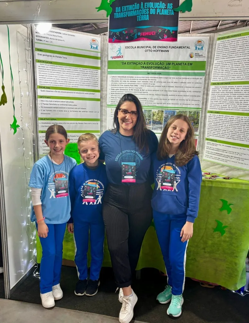 Os estudantes Anna Carolina Witt Peixoto, Gabriella Aparecida de Saiba Fristch e Pétros Rangel Ram, do 4º ano da Escola Municipal de Ensino Fundamental Otto Hoffmann, representaram Nova Petrópolis na 33ª edição da Feira Municipal de Ciências e Ideias de Esteio (FEMUCI), realizada nos dias 8 e 9 de outubro de 2025, no Parque de Exposições Assis Brasil. Sob orientação da professora Letícia Schneider, o trio apresentou a pesquisa intitulada “Da extinção à evolução: um planeta em transformação”, que já havia sido destaque na Mostra Municipal do Conhecimento, realizada em agosto, na categoria destinada aos estudantes do 4º ao 6º ano.