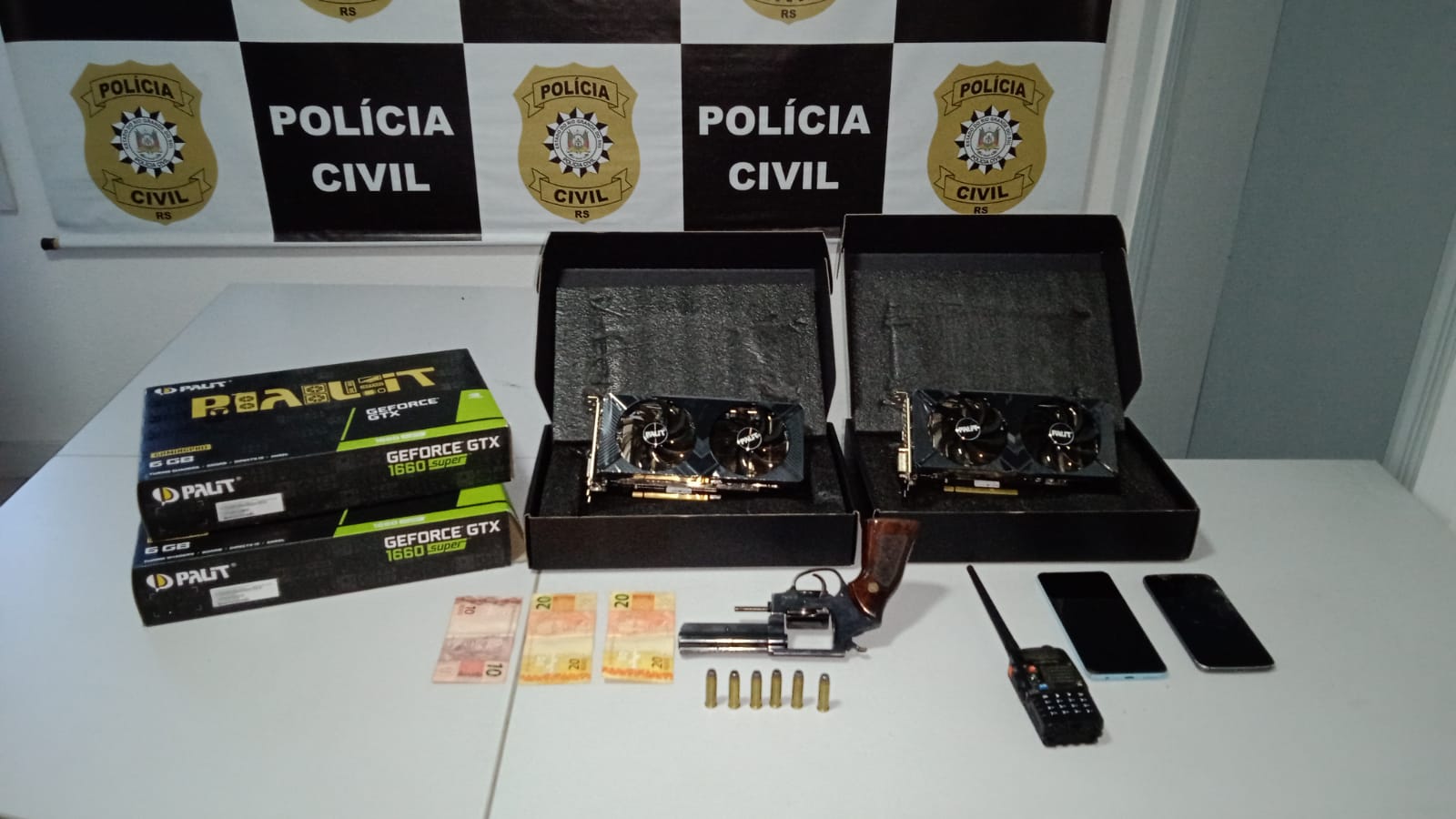 Estância Velha- Na tarde desta quinta-feira, 4 , sob coordenação do delegado Rafael Sauthier, os policiais da Delegacia de Polícia de Estância Velha prenderam em flagrante dois indivíduos por roubo qualificado e porte de arma de fogo raspada. Um policial plantonista da Delegacia de Polícia de Estância Velha, colocou à venda 2 placas de vídeo game no site OLX. No dia 23 de outubro, um interessado lhe chamou no whatsapp para efetuar a compra. O negócio evoluiu e foi acertado a entrega das 2 placas na Rua Regina Mundi, bairro Cristo Rei em Novo Hamburgo. O valor combinado foi de R$10.800,00. O interessado mencionou que as placas seriam retiradas pelo seu sobrinho Rogério (nome falso) e que o pagamento seria por Pix após a entrega.