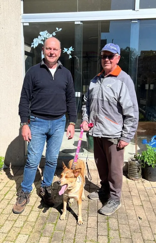 O novo tutor é seu Nelson, morador de Estância Velha, que havia perdido sua parceirinha de quatro patas há algum tempo. Ao conhecer a história de Eva por indicação de Clóvis — que também aparece com ele na foto —, decidiu abrir seu coração e sua casa para recebê-la.