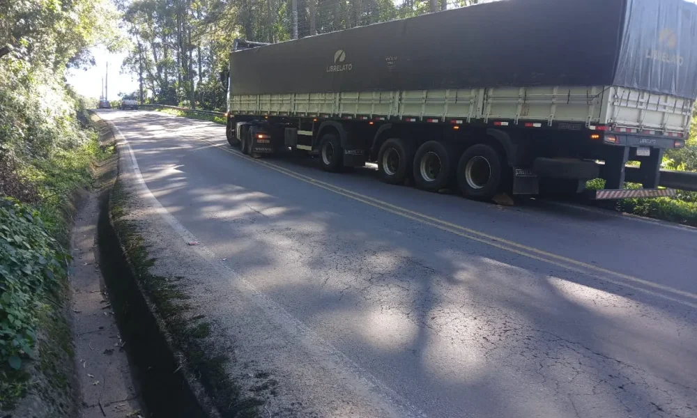 Carreta estragada ocupa faixa da VRS-873 em Morro Reuter