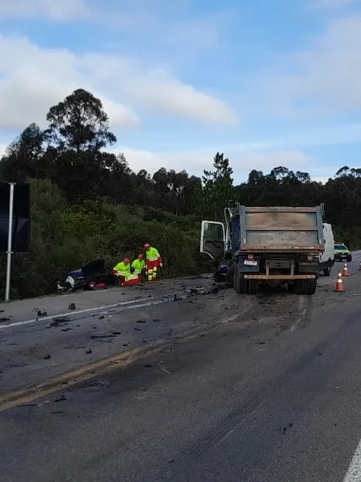 Uma colisão frontal entre um caminhão caçamba e um automóvel Nissan Sentra deixou duas pessoas mortas na tarde desta quinta-feira, 10, na BR-116, em Pelotas. O acidente ocorreu no km 491 da rodovia, próximo à ponte sobre o arroio Corrientes.