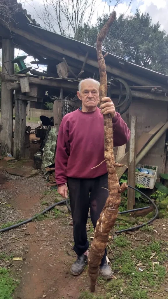 No interior de Portão, Sertão Capivara, que faz divisa com Lindolfo Collor, uma colheita inusitada virou assunto entre vizinhos e amigos. O produtor rural Seu Ari, conhecido pelo cuidado e dedicação à terra, retirou do chão um aipim doce que impressiona não apenas pelo sabor, mas pelo tamanho: nada menos que 2 metros e 2 centímetros de comprimento.