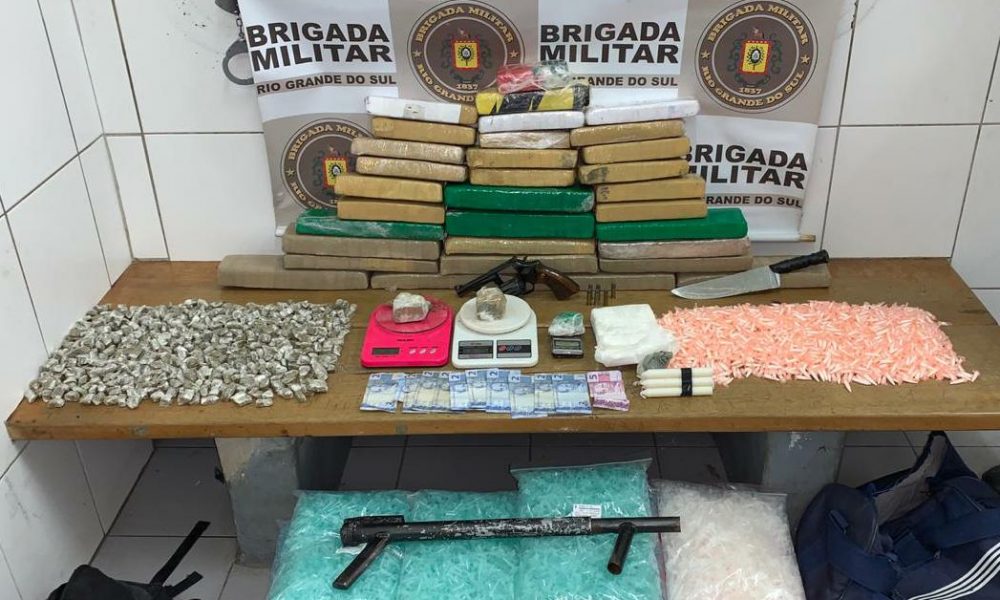 O homem foi preso por volta das 22 horas, no bairro Canudos, com 26,284 kg de maconha e 1.530 Kg de cocaína, com um revólver calibre .38 e balanças de precisão. Sua mulher, de 25 anos, também foi presa.