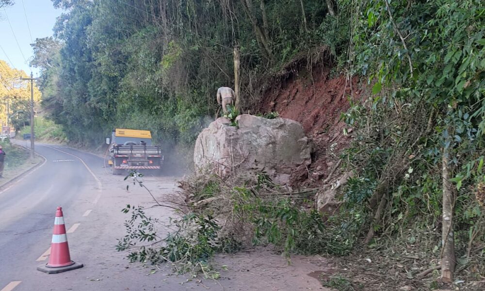 Equipes estão trabalhando para retirar pedra que caiu no acesso ao Walachai, em Morro Reuter