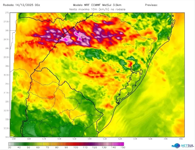A MetSul adverte que, com base nas projeções, existe risco de temporais com rajadas de vento de 70 m/h a 100 km/h em muitas cidades gaúchas nesta segunda-feira, porém em alguns locais é provável que o vento passe de 100 km/h e não se afasta o risco de que isoladamente algumas tempestades possam ser muito severas com vento acima de 120 km/h.