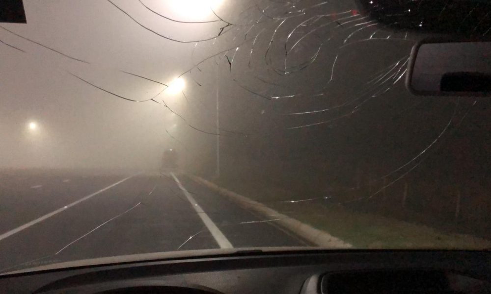 Um homem de 35 anos, de Santana do Livramento, viajava com a mulher e a filha de 5 anos, quando teve seu veículo Amarok atingido por um bloco de concreto, que quebrou o parabrisa.