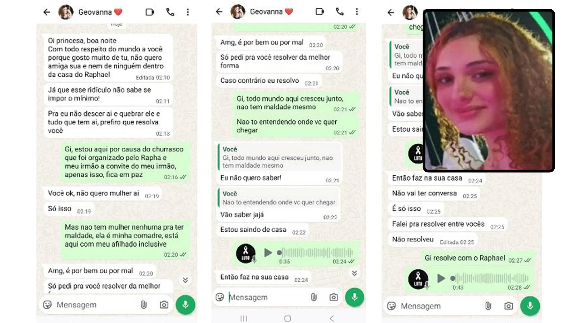 Segundo a Polícia Civil, Geovanna enviou mensagens a uma conhecida do casal afirmando que iria até a casa de Raphael e que “não teria conversa”. Em um dos trechos, escreveu que iria “quebrar ele e tudo que tem aí”, após demonstrar ciúmes por causa de uma confraternização entre amigos na residência do rapaz, no bairro Parque Regina.