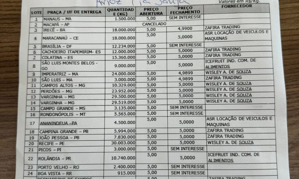Conab anunciou a anulação dos lotes arrematados em leilão