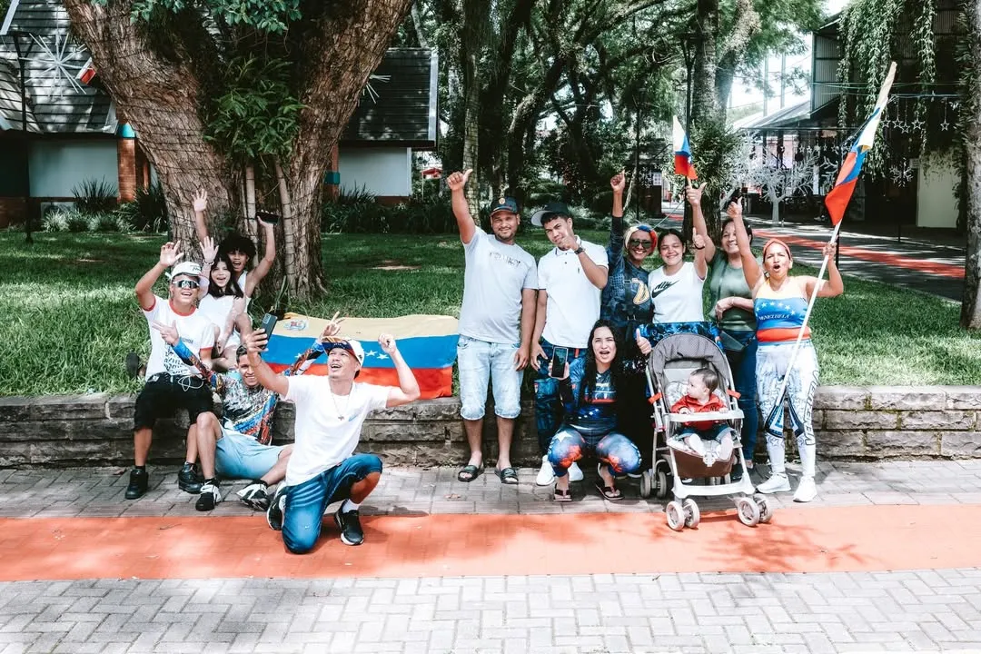Moradores venezuelanos residentes em Dois Irmãos celebraram, neste sábado (3), a queda do presidente da Venezuela, Nicolás Maduro. A manifestação ocorreu na Praça do Imigrante e foi registrada pelo fotógrafo Matheus C. Felipe, que acompanhou o momento de comemoração considerado histórico pela população venezuelana no mundo todo.