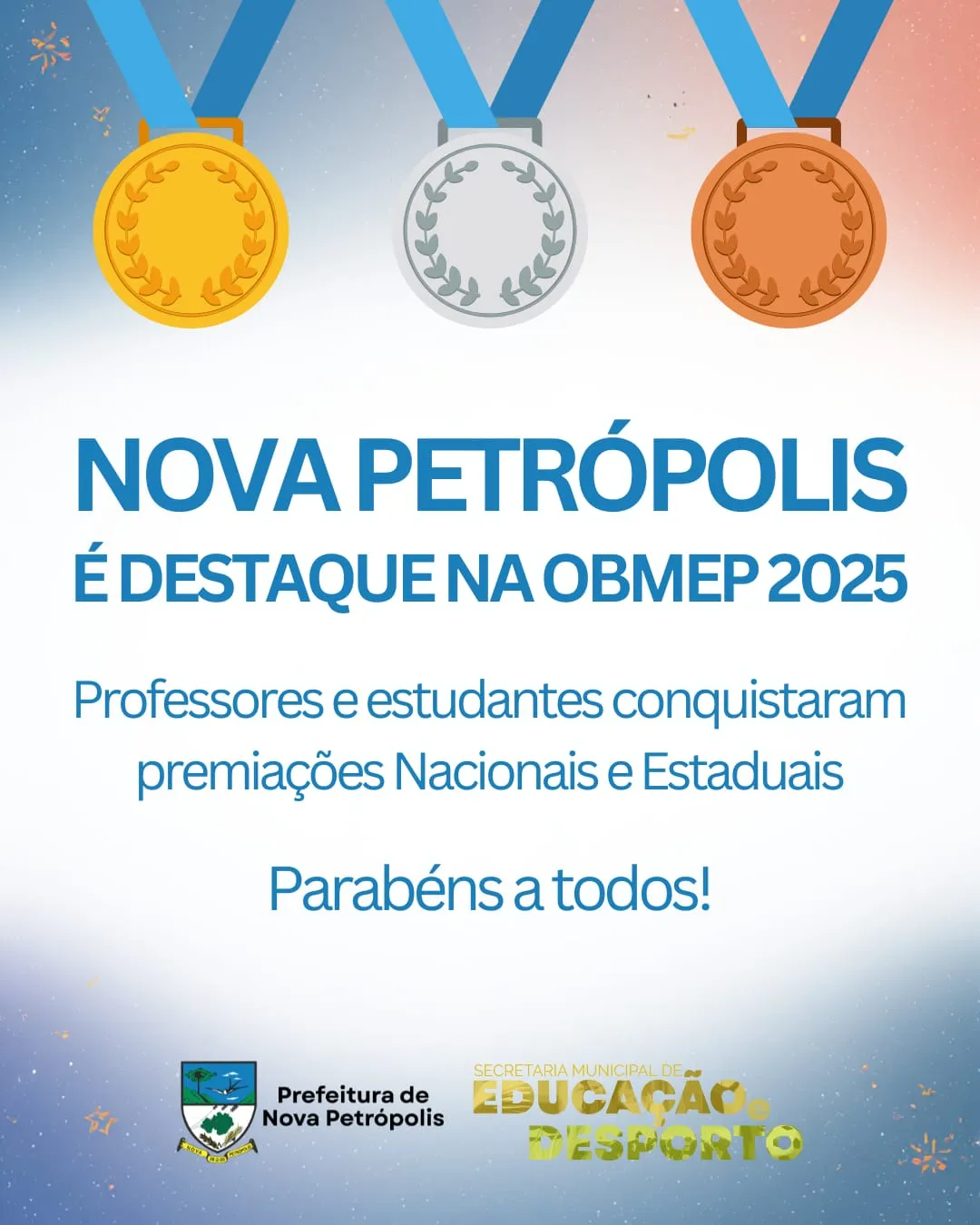 Estudantes de Nova Petrópolis foram destaque na 20ª edição da Olimpíada Brasileira de Matemática das Escolas Públicas e Privadas (OBMEP 2025), conquistando importantes premiações em nível nacional e estadual: 4 medalhas de Bronze Nacional; 11 medalhas Estaduais para o Nível 1 (6º e 7º Ano), sendo uma de Ouro, duas de Prata e oito de Bronze; 10 medalhas Estaduais no Nível 2 (8º e 9º Ano), sendo uma de Prata e nove de Bronze; além de 17 Menções Honrosas no Nível 1, 13 Menções Honrosas no Nível 2 e 5 Menções Honrosas no Nível 3 (Ensino Médio).