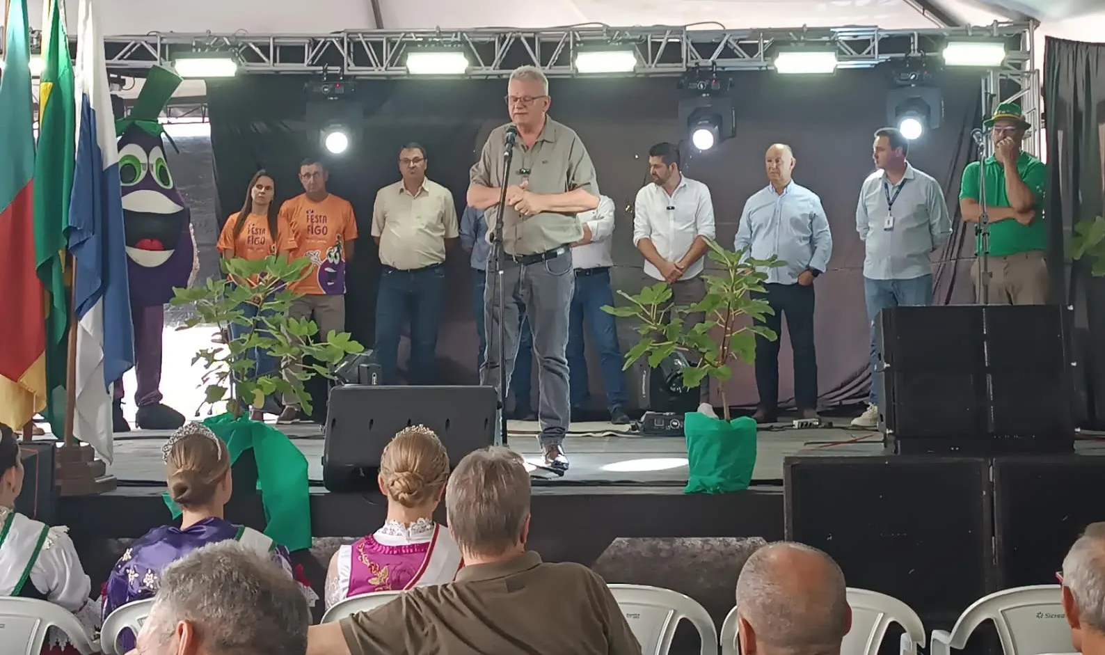 Durante a solenidade, o prefeito Daniel Michaelsen, acompanhado do vice-prefeito Alexandre da Silva, ressaltou a importância da Festa do Figo não apenas como evento cultural, mas também como um espaço de valorização dos agricultores e de fortalecimento da economia local. Em seu pronunciamento, o prefeito destacou o papel fundamental da agricultura no desenvolvimento do município, enfatizando o trabalho e a dedicação das famílias produtoras que mantêm viva a tradição ao longo das gerações.