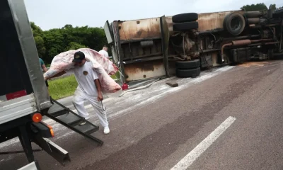 Caminhão baú de Lindolfo Collor tomba e freeway fica bloqueada