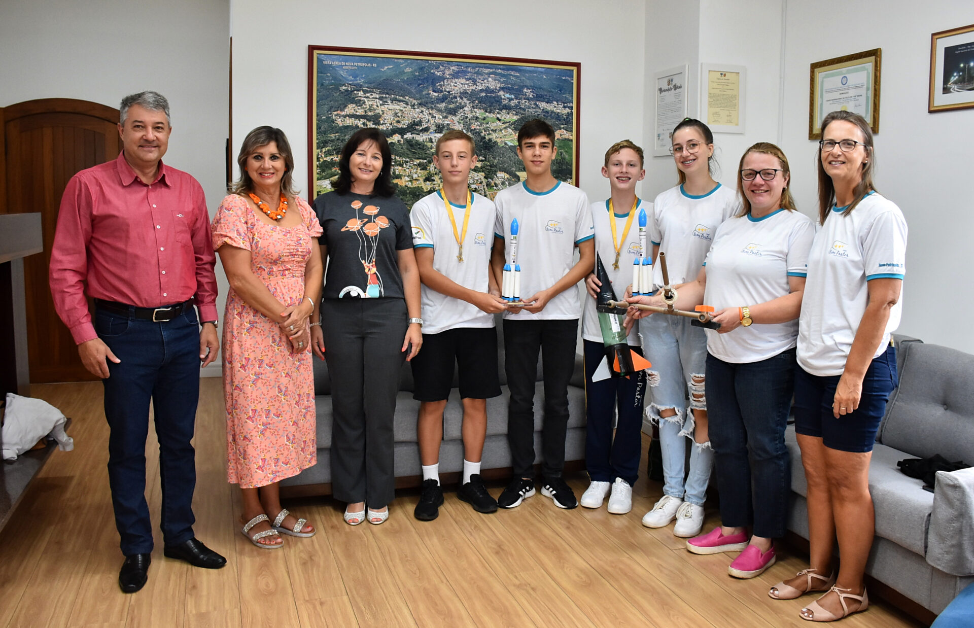 Nesta sexta-feira, 17 de fevereiro, o prefeito Jorge Darlei Wolf e a secretária de Educação, Cultura e Desporto, Gislaine Leal, receberam na sede da Prefeitura os estudantes, as professoras que orientaram o projeto e a diretora da escola, e parabenizaram pelo desempenho no evento. “Nós temos muito orgulho de vocês!”, afirmou o chefe do Executivo nova-petropolitano às equipes.