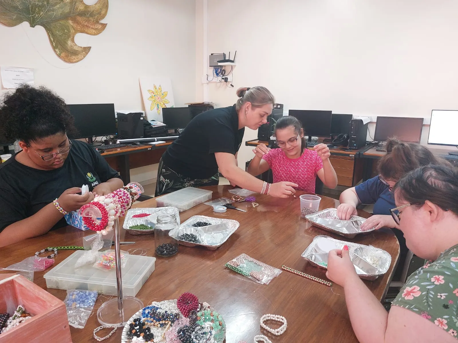 Integrantes do projeto Arte que Encanta, voltado principalmente para a realização de trabalhos manuais, iniciado há três anos na Associação de Pais e Amigos dos Excepcionais (APAE) de Ivoti, é conduzido pela professora Janete Politowski e se reúnem às quartas-feiras para a criação de pulseiras e outros itens.
