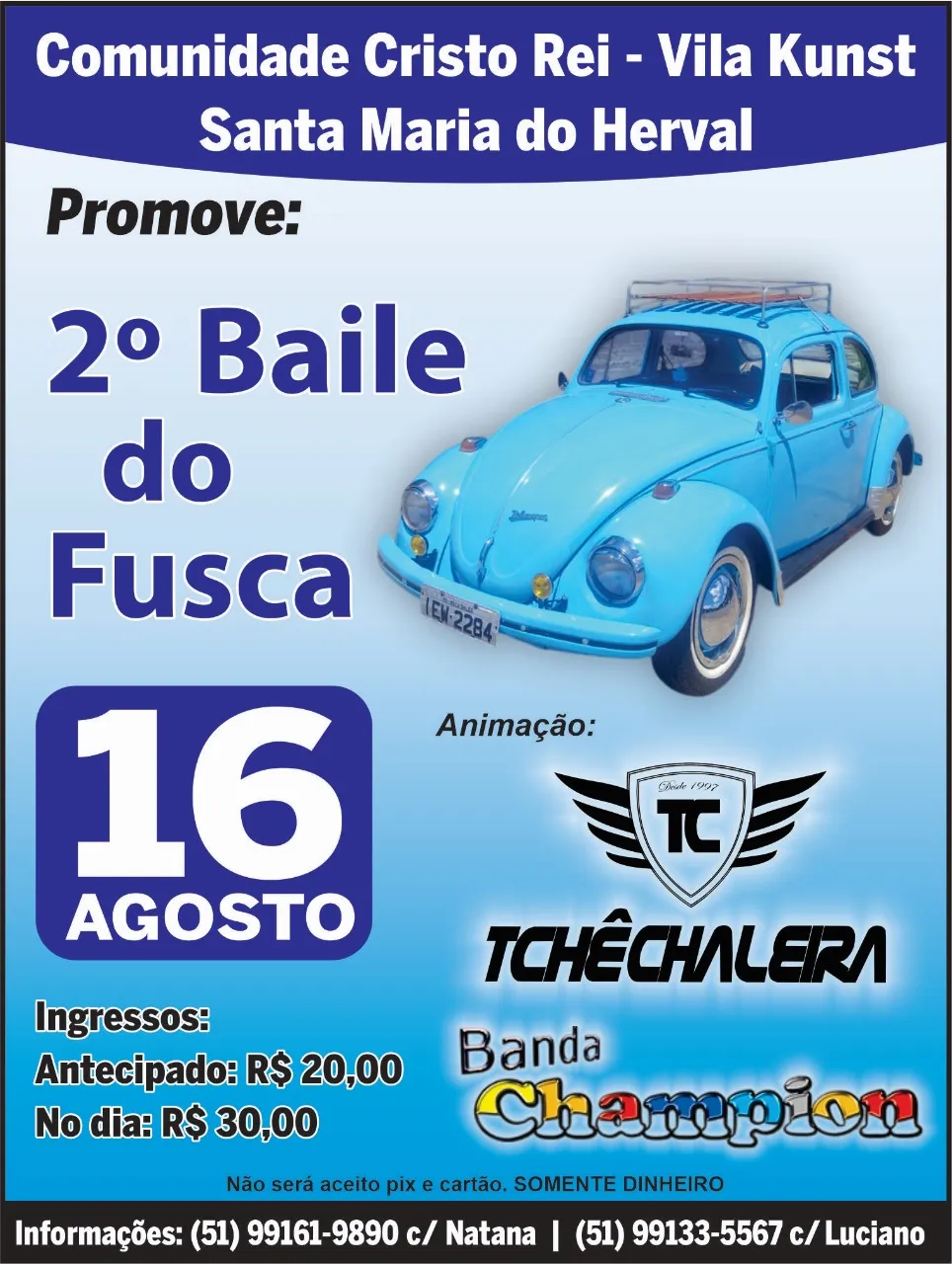 Prepare o traje e marque na agenda: no próximo dia 16 de agosto, a charmosa Comunidade Cristo Rei, na Vila Kunst, em Santa Maria do Herval, será tomada por uma atmosfera vibrante de tradição, música e nostalgia. Está chegando a segunda edição do Baile do Fusca, uma noite feita sob medida para quem ama boas histórias, cultura local e, claro, esse ícone das estradas que é o querido Fusquinha.