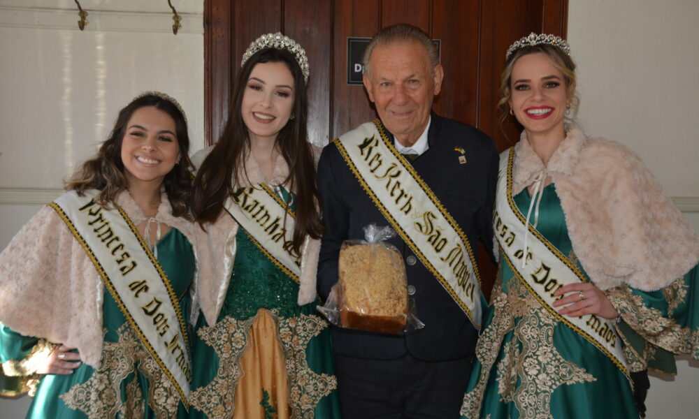 A redação do jornal recebeu quinta-feira, 30, a comitiva integrada pelas Soberanas de Dois Irmãos, Rainha Tainara Schneider, Princesas Djenifer Kronbauer e Betina Ludwig, Rei do Kerb do São Miguel, Darcy Engelmann, secretário de Desenvolvimento Econômico, Edson Maicá, e a chefe do Departamento de Turismo, Larissa Mentz, que vieram com o intuito de divulgar as informações do Baumschneis Kolonial Kaffee. “Esse ano é especial, pois vamos ver muitos sorrisos no evento, devido a flexibilização do uso da máscara.”, disse a princesa Betina Ludwig.