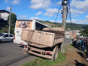 Caminhão sem freio atinge poste na descida para Estância Velha