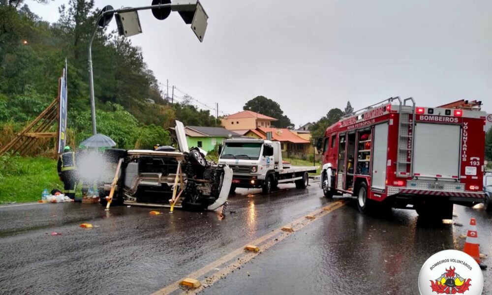 Carro capota na BR-116, próximo às lombadas eletrônicas em Nova Petrópolis