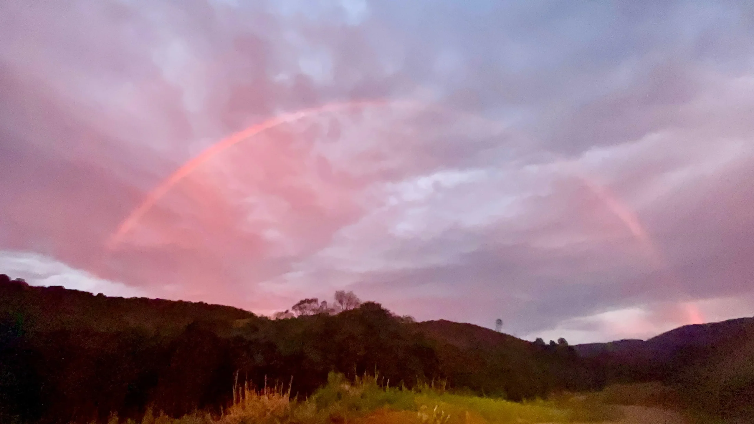O amanhecer desta terça-feira (2) surpreendeu moradores da região em um espetáculo raro da natureza. O céu ganhou tons intensos de rosa e lilás, cortado por um arco-íris que surgiu em meio às nuvens carregadas, criando um cenário de rara beleza.