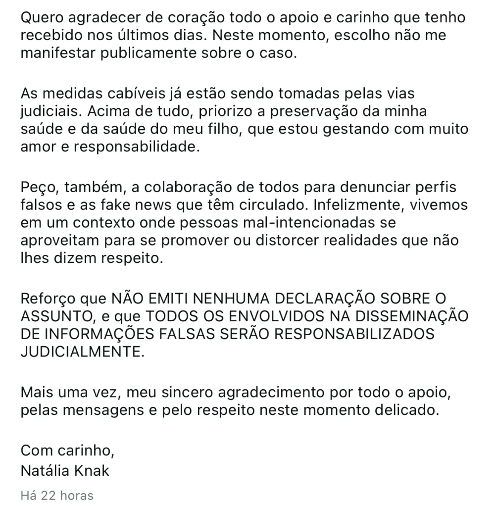 Natália Knak veio a público para se pronunciar oficialmente