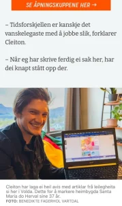 Viu como a Começo é cultura? Agora você já sabe um pouco de norueguês. Na legenda da foto, diz: “Cleiton criou um jornal inteiro com artigos do seu apartamento aqui em Volda. A iniciativa marca o 37º aniversário da sua cidade natal, Santa Maria do Herval”. A foto é de Benedikte Fagehol Vartdal. O nome do jornal é Møre-Nytt, que, sinceramente, não sei o que quer dizer.