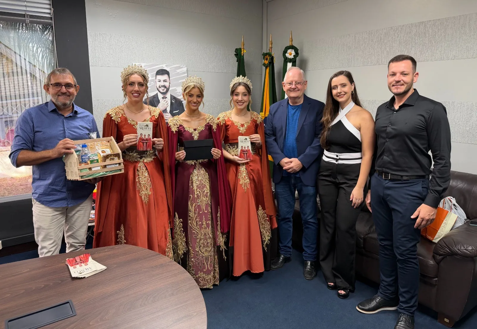 O grupo foi recebido pelo chefe de Gabinete de Estância Velha, Jacob Immig, que destacou a importância da integração regional e da valorização cultural. “É uma grande satisfação receber a comitiva aqui no gabinete. A presença das soberanas e dos representantes reforça a importância de valorizarmos nossas tradições e fortalecermos os laços entre os municípios da região. Ficamos muito felizes com a visita e desejamos ainda mais sucesso ao evento”, afirmou. A programação completa da XX Festa Municipal do Aipim pode ser conferida no perfil oficial do evento no Instagram.