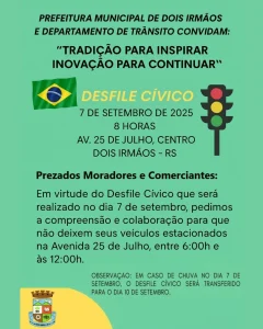 Dois Irmãos – A Prefeitura de Dois Irmãos, por meio do Departamento de Trânsito, informa que no próximo domingo, 7 de setembro, será realizado o Desfile Cívico, a partir das 8 horas, na Avenida 25 de Julho, no Centro da cidade.
