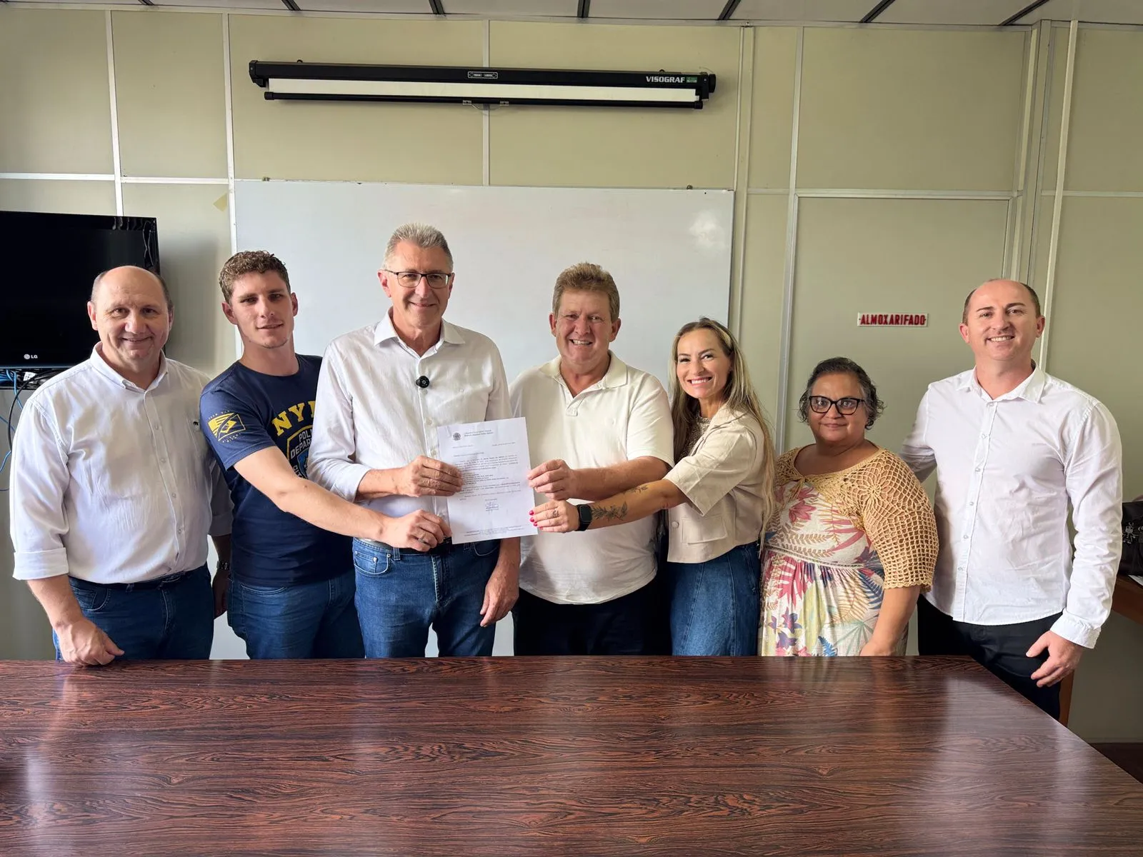 Na foto: recurso sendo recebido pelo prefeito Gilnei, vereador Paulo, secretário de turismo Lucas Molling, secretária de assistência social Tânia e suplente de vereadora Nara.
