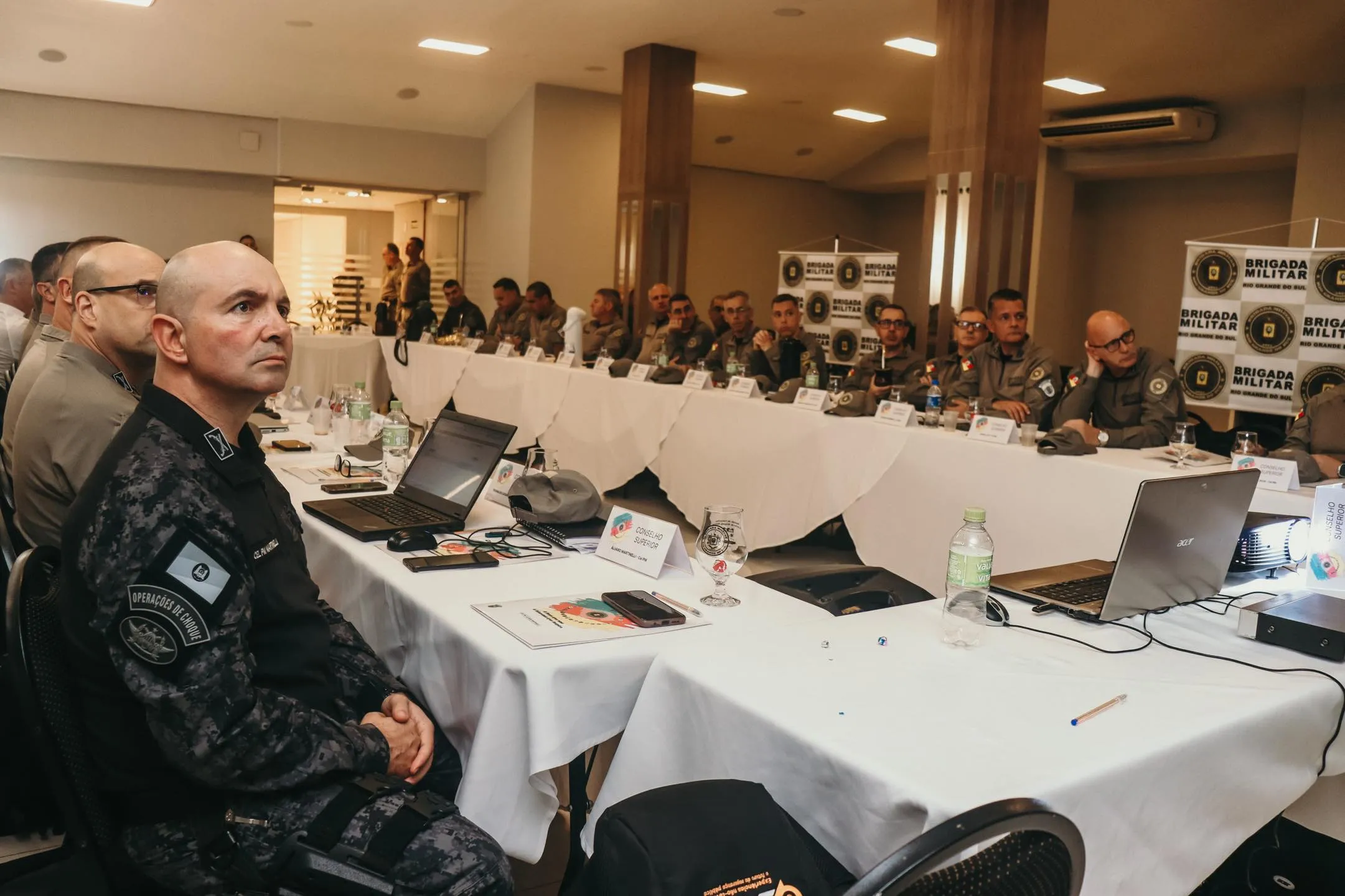 A reunião foi realizada com o objetivo de tratar de temas estratégicos relacionados à segurança pública no estado, fortalecer o alinhamento entre os comandos regionais e discutir diretrizes operacionais e administrativas da corporação.