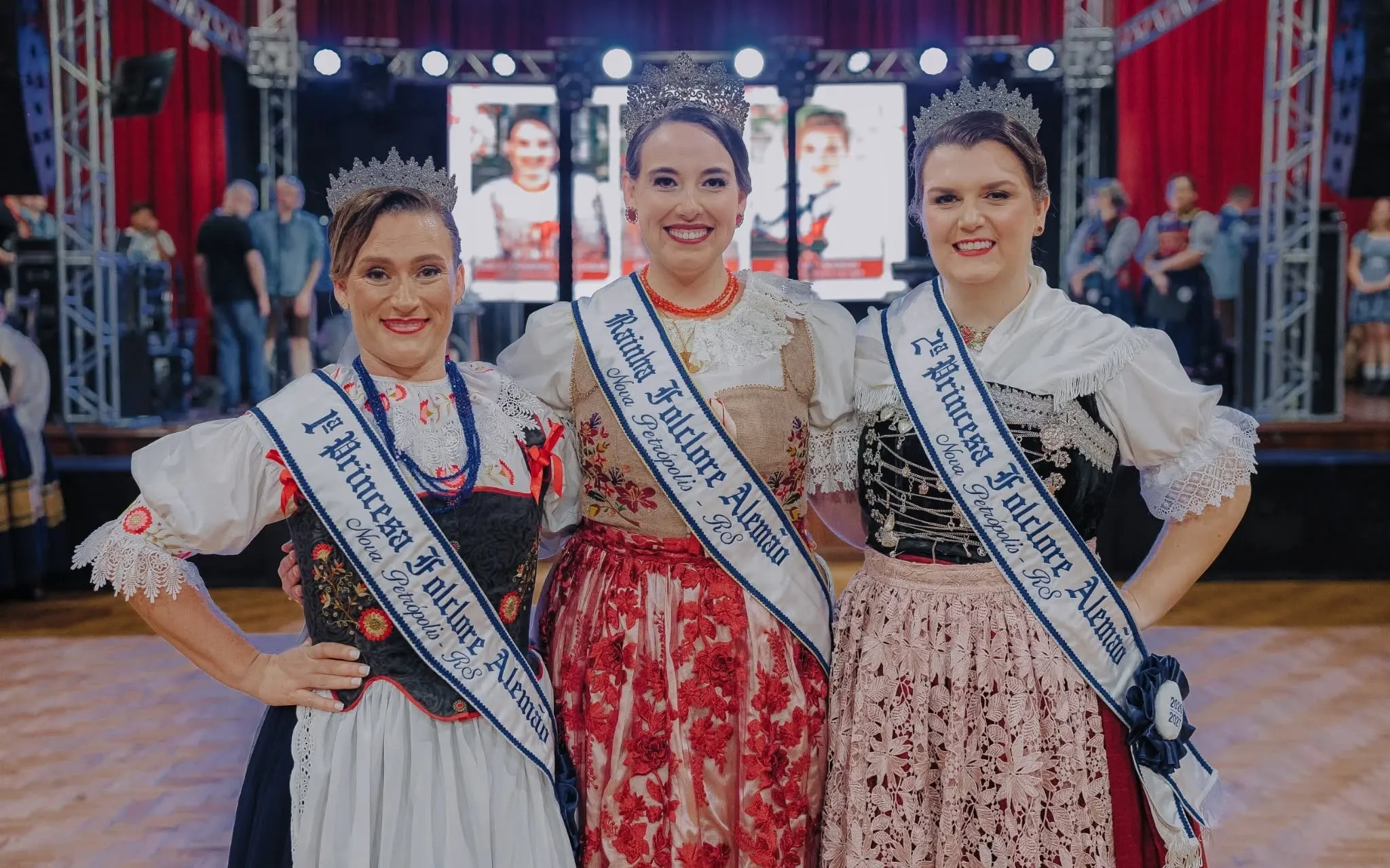Nova Petrópolis- Já tem sua nova corte do Folclore Alemão para o período 2026/2027. A escolha ocorreu na noite deste sábado, 18 de abril, durante o 37º Baile de Escolha das Soberanas do Folclore Alemão, realizado na Sociedade Tiro ao Alvo. Representando o Grupo de Danças Folclóricas Sonnenschein, Jéssica Fernanda Schaab foi eleita Rainha. O trio de soberanas é completado por Olívia Nienow, do Böhmerlandtanzgruppe, como 1ª Princesa, e Ketrin Ananda Kich, do Grupo de Danças Folclóricas Internacional, como 2ª Princesa.