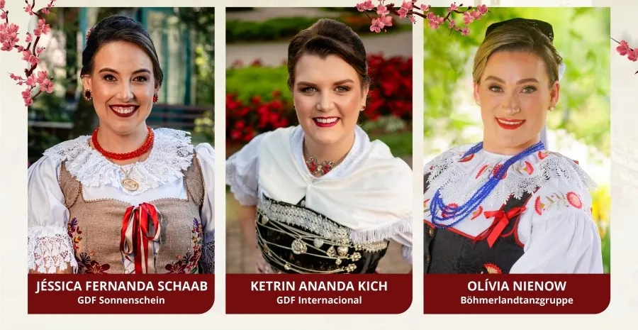 Jéssica Fernanda Schaab, do Grupo de Danças Folclóricas Sonnenschein; Ketrin Ananda Kich, do Grupo de Danças Folclóricas Internacional, e Olívia Nienow, do Böhmerlandtanzgruppe; concorrem à corte, que também representa o Município de Nova Petrópolis. O Baile de Escolha das Soberanas do Folclore Alemão exalta a força e a riqueza cultural do Município, trazendo apresentações folclóricas e a tradicional escolha da corte que representará o Festival Internacional de Folclore ao longo de 2026. A avaliação das candidatas inicia na tarde de sábado, 18 de abril, no Parque Aldeia do Imigrante, onde as representantes dos grupos terão contato com os jurados para demonstrar seus conhecimentos. Os quesitos avaliados são língua alemã, turismo local, cultura local, histórico do traje, beleza e simpatia, história do Festival Internacional de Folclore, oratória, dança individual e dança em grupo.