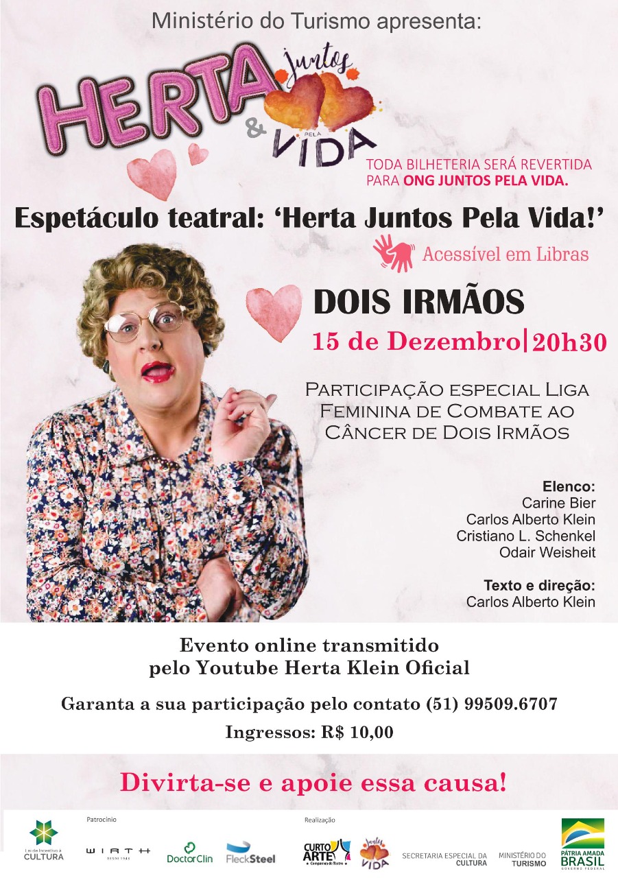 Dois Irmãos- No dia 15 às 20h30 acontece o Espetáculo teatral ‘Herta juntos pela vida’. O evento tem parceria com a Liga Feminina de Combate ao Câncer e todo o valor dos ingressos serão revertidos para ONG Juntos pela vida. A participação é de R$10 e o teatro será transmitido ao vivo pelo YouTube Herta Klein Oficial. Informações (51) 995096707.