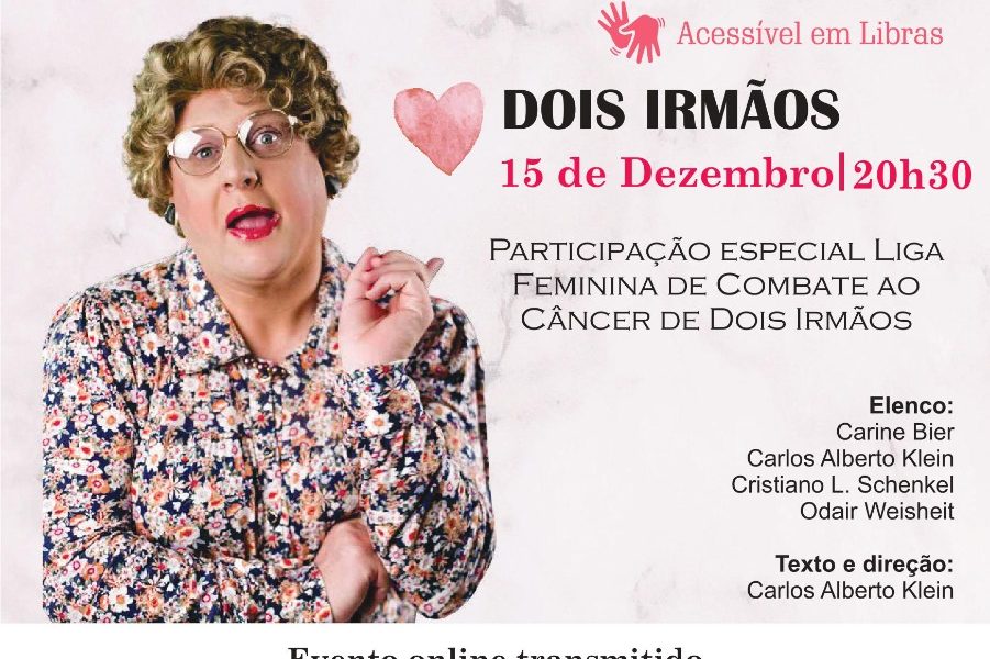 Dois Irmãos- No dia 15 às 20h30 acontece o Espetáculo teatral ‘Herta juntos pela vida’. O evento tem parceria com a Liga Feminina de Combate ao Câncer e todo o valor dos ingressos serão revertidos para ONG Juntos pela vida. A participação é de R$10 e o teatro será transmitido ao vivo pelo YouTube Herta Klein Oficial. Informações (51) 995096707.