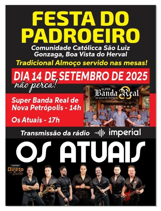 Santa Maria do Herval | A Comunidade Católica São Luiz Gonzaga, de Boa Vista do Herval, prepara-se para receber a tradicional Festa do Padroeiro neste domingo, dia 14 de setembro de 2025. O evento promete reunir fé, gastronomia típica e muita música, com destaque para a apresentação do renomado grupo Os Atuais, a partir das 17h.