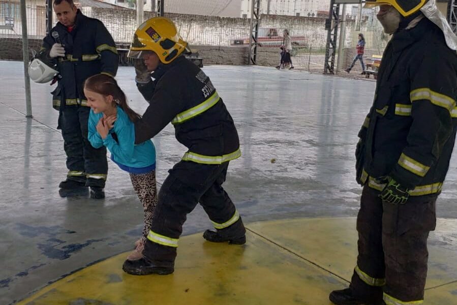 A corporação realiza uma simulação envolvendo toda a comunidade escolar, passando orientações e informações importantes para o conhecimento de todos.