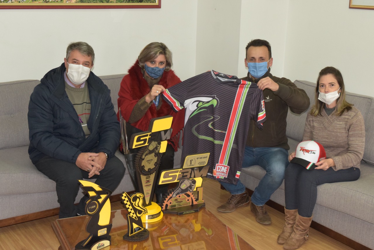 Nova Petrópolis – O piloto e diretor da Falcon Power Racing (FPR), Alessandro Perinazzo, esteve na Prefeitura para falar sobre a intenção da equipe em realizar projetos conjuntos à Administração para tornar a BR-116 mais segura para todos, além de falar sobre a importância dos equipamentos de segurança e dos cursos de pilotagem como forma de conscientização do uso correto da motocicleta. Perinazzo esteve acompanhado de sua esposa, Elisiane Schumann, e foi recebido pelo prefeito Jorge Darlei Wolf e pela secretária de Desporto, Gislaine Leal.
