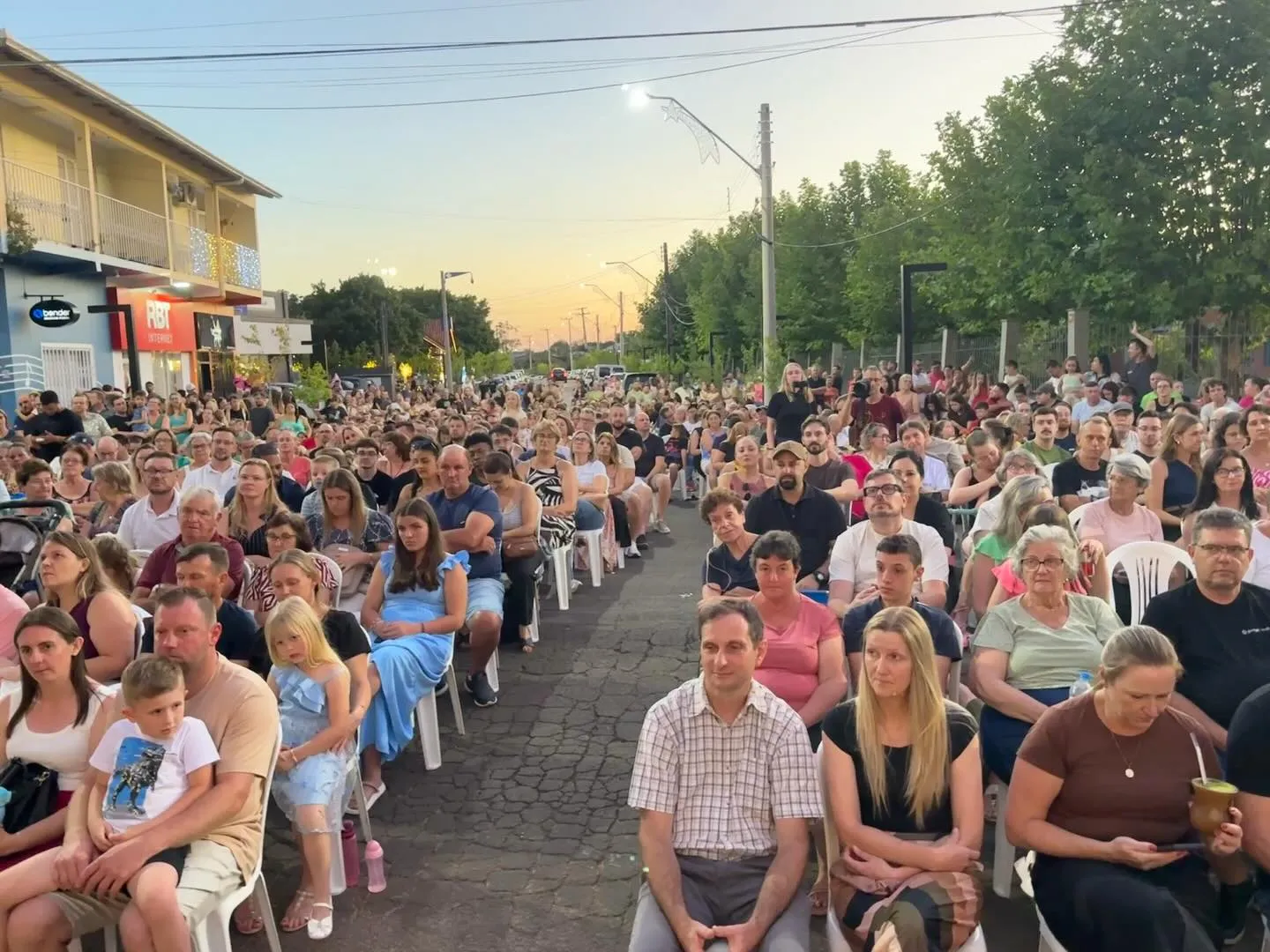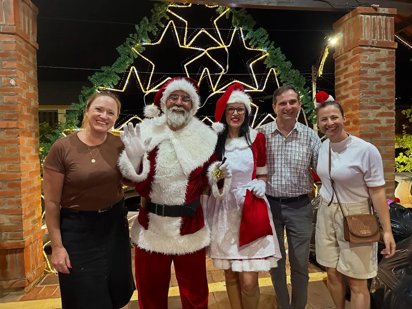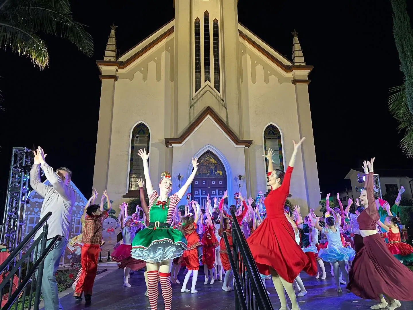 Morro Reuter – O público compareceu em peso na noite de encerramento da programação do Natal Encantado de Morro Reuter 2025 neste domingo, dia 14. O Espetáculo “É Tempo de Natal”, Ballet Fernanda Selbach, e a chegada do Papai Noel de Rapel na Igreja Matriz Imaculada Conceição, seguida de entrega de presente na Praça Municipal, encantaram a todos que prestigiaram a noite.