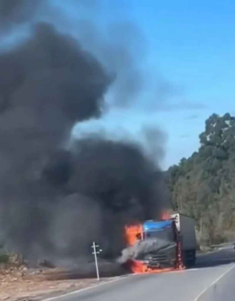 Imagens registradas no momento mostram o veículo tomado por chamas e fumaça densa. As causas do incêndio ainda não foram informadas, assim como o estado de saúde do condutor.