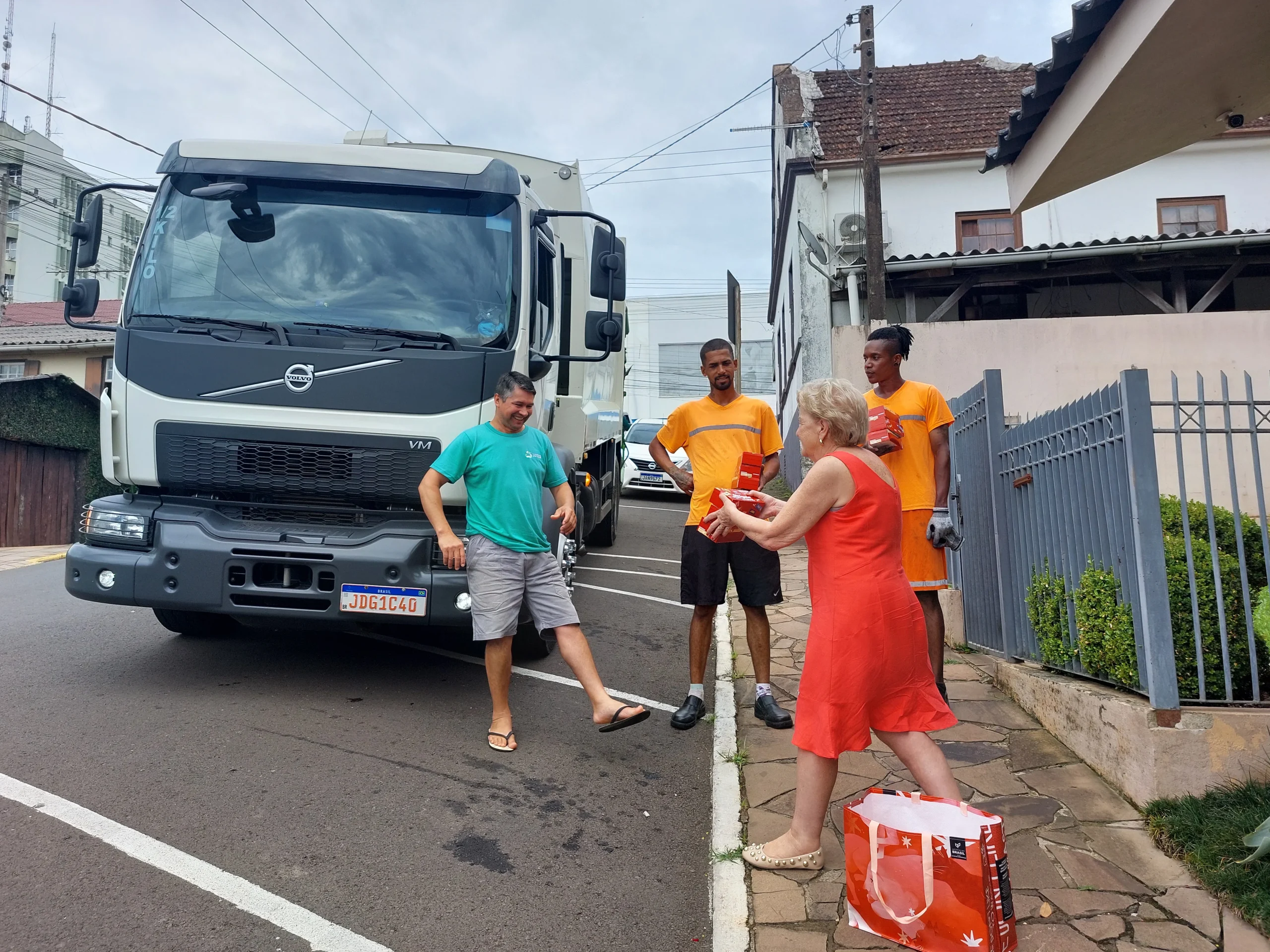 Na manhã de terça-feira, 23, os funcionários da empresa que realiza a coleta de lixo em Ivoti foram surpreendidos com a entrega de caixas de bombom pela ex-prefeita do município, Maria de Lourdes Bauermann. Ela relata que realiza as entregas do mimo há cerca de 20 anos e um dos colaboradores, que recebeu os bombons nesta manhã, relata que já recebe a sua caixa há 10 anos.