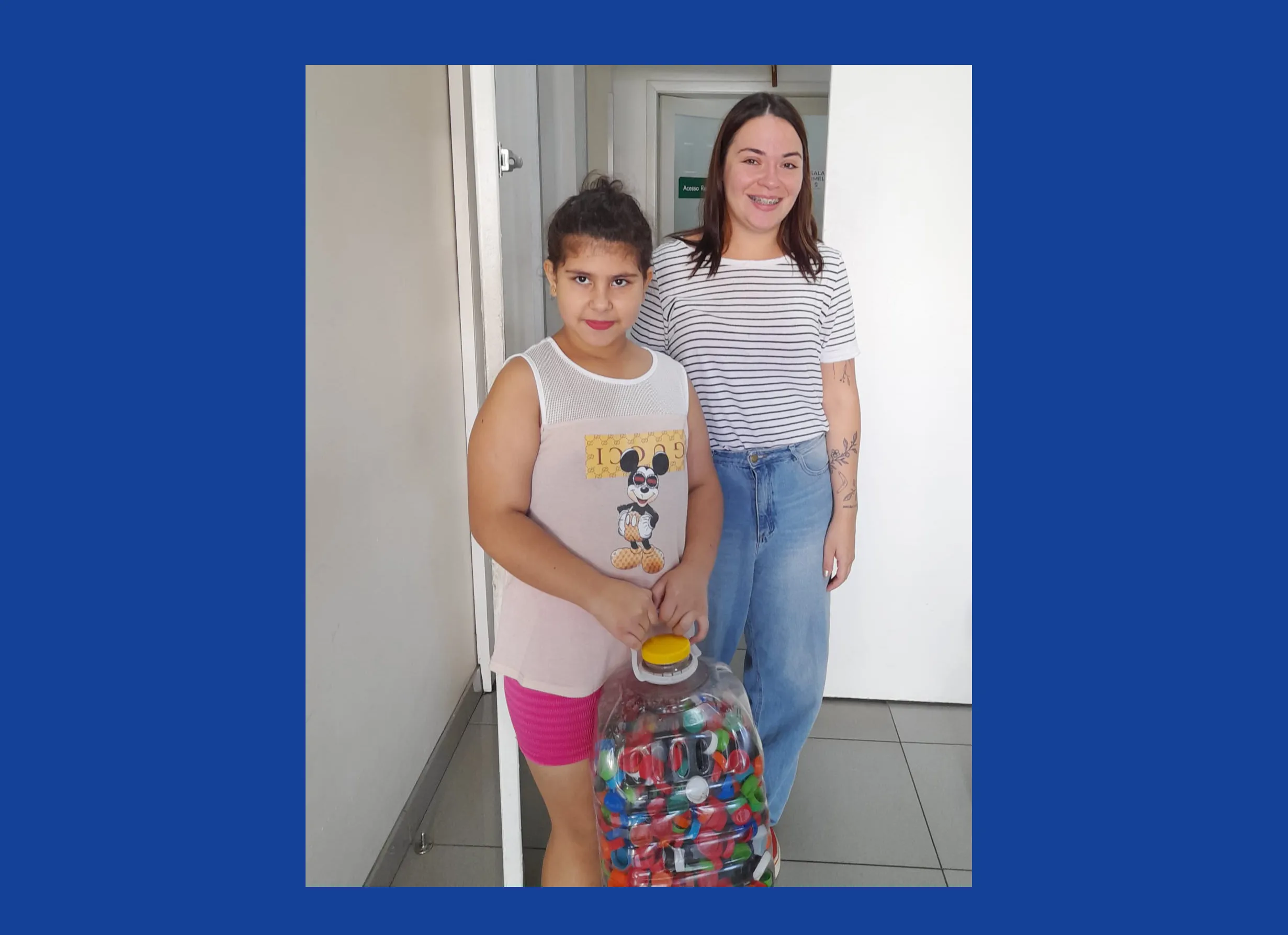 A estudante Sofia de Oliveira, de 9 anos, realiza a arrecadação e doação de tampinhas desde os 6 anos de idade. Moradora de Lindolfo Collor, Sofia tem como motivação o apoio dos pais Paulo César de Oliveira e Tanamara de Oliveira, que contaram para ela que as tampinhas podem ajudar as pessoas na compra de cadeiras de roda e outros recursos. “Ela ama fazer isso, leva para o Hospital São José e também para a escola”, afirma a mãe, Tanamara.