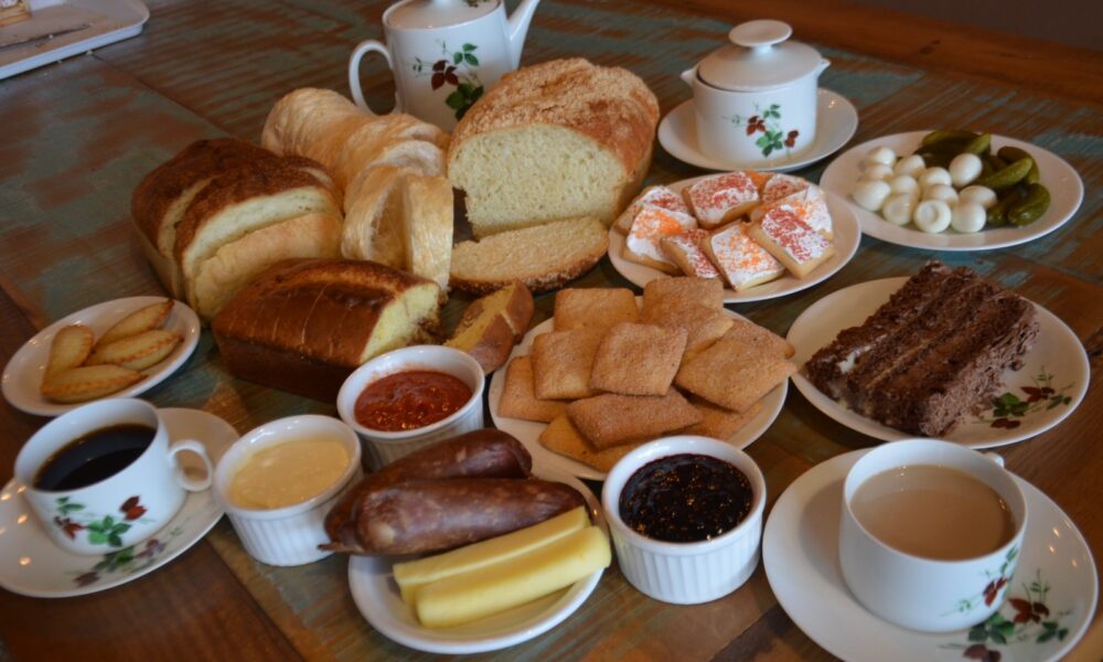 SABOR QUE ATRAVESSA GERAÇÕES – Junto com as xícaras e bules, vinham para a mesa de pães de trigo e milho, roscas de polvilho, cucas, queijo, linguiça, morcilha, nata, requeijão, mel, salsicha bock, rocambole, rabanete e pepino. Tudo de produção própria, artesanal, com receitas que atravessam gerações temperadas com muito amor. Estava nascendo em Morro Reuter o logo famoso café colonial conhecido nos dias de hoje e que atrai milhares de turistas ao município a cada fim de semana.